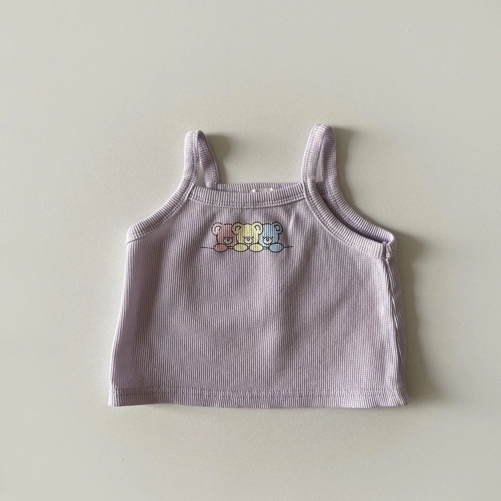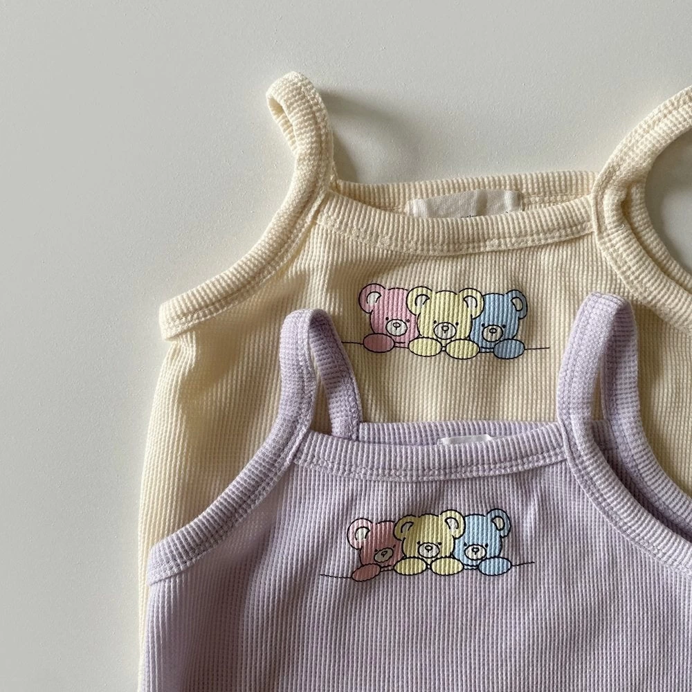 This waffle cami top features skinny straps and the cutest teddy bear trio printed on the front chest.