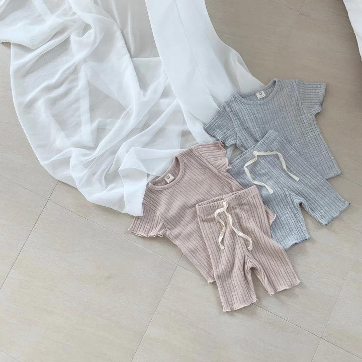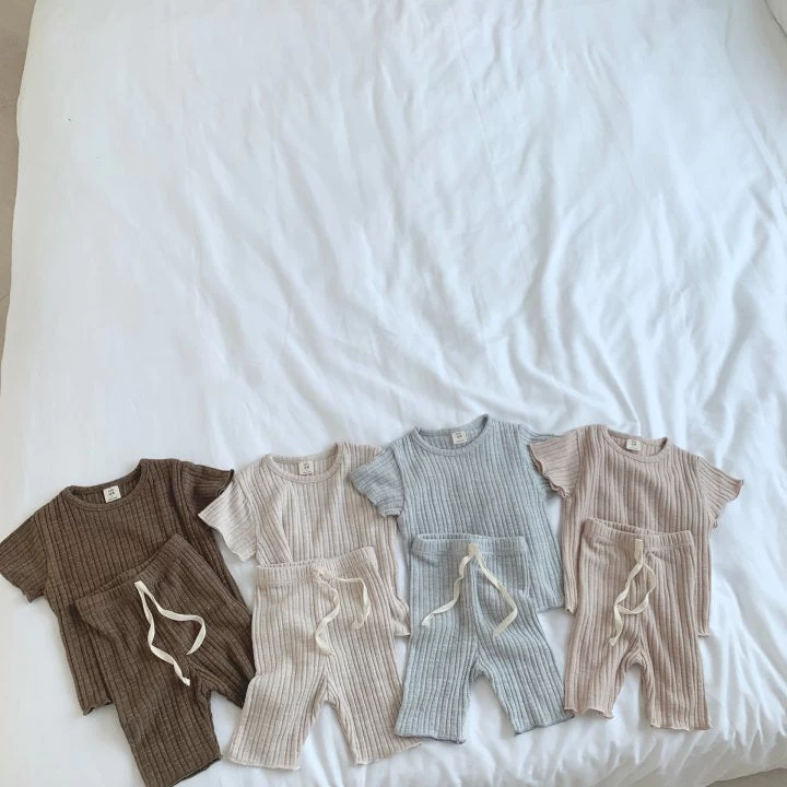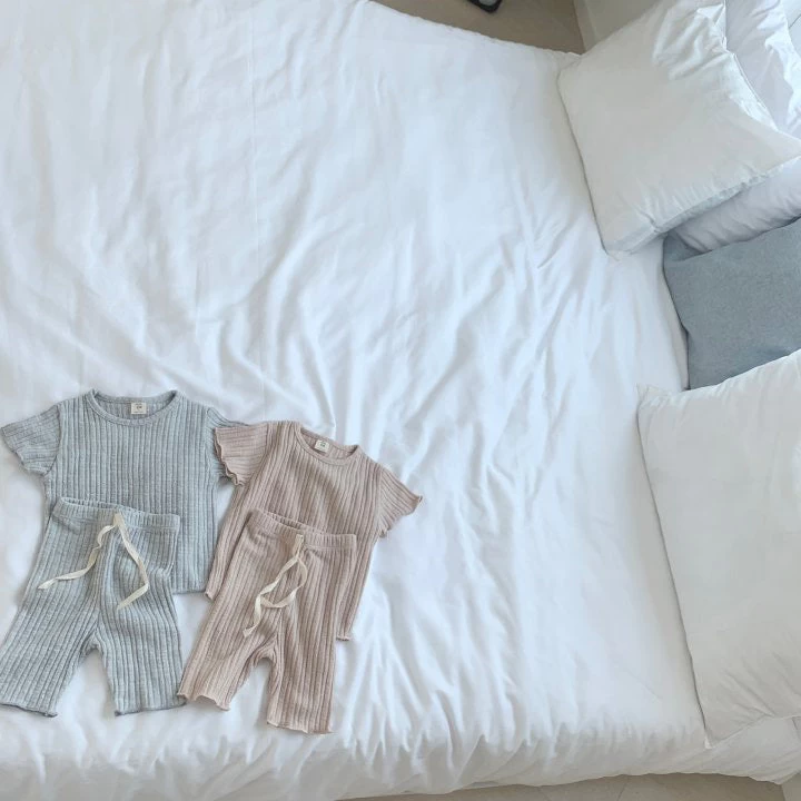 Short sleeved ribbed top with matching bottoms.