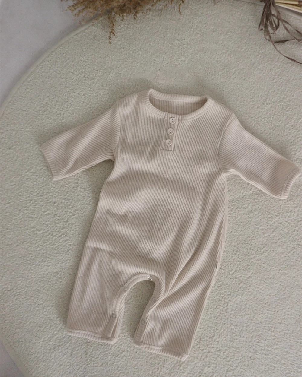 A classic ribbed playsuit featuring button up details and snap closures for fast and easy diaper changes.Â