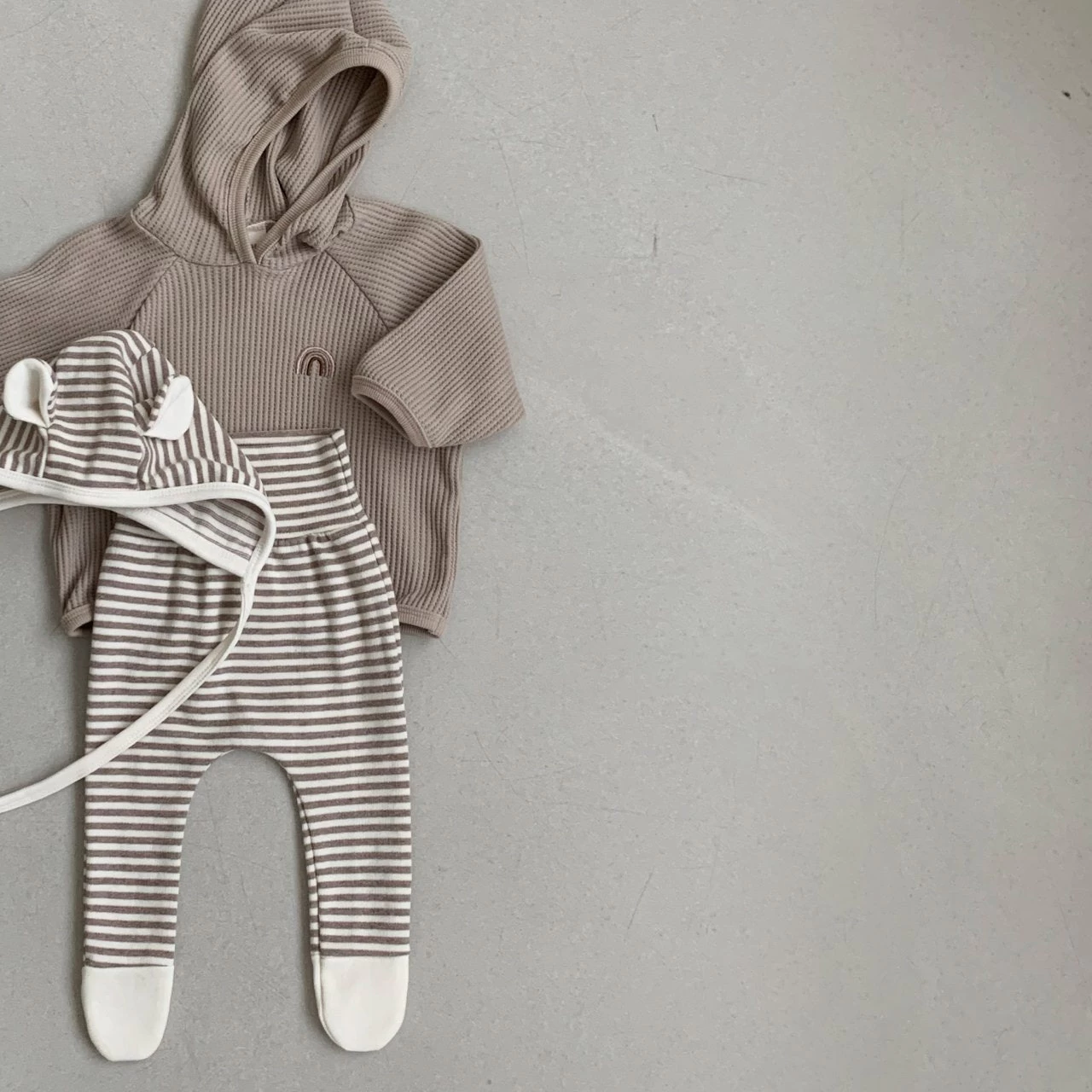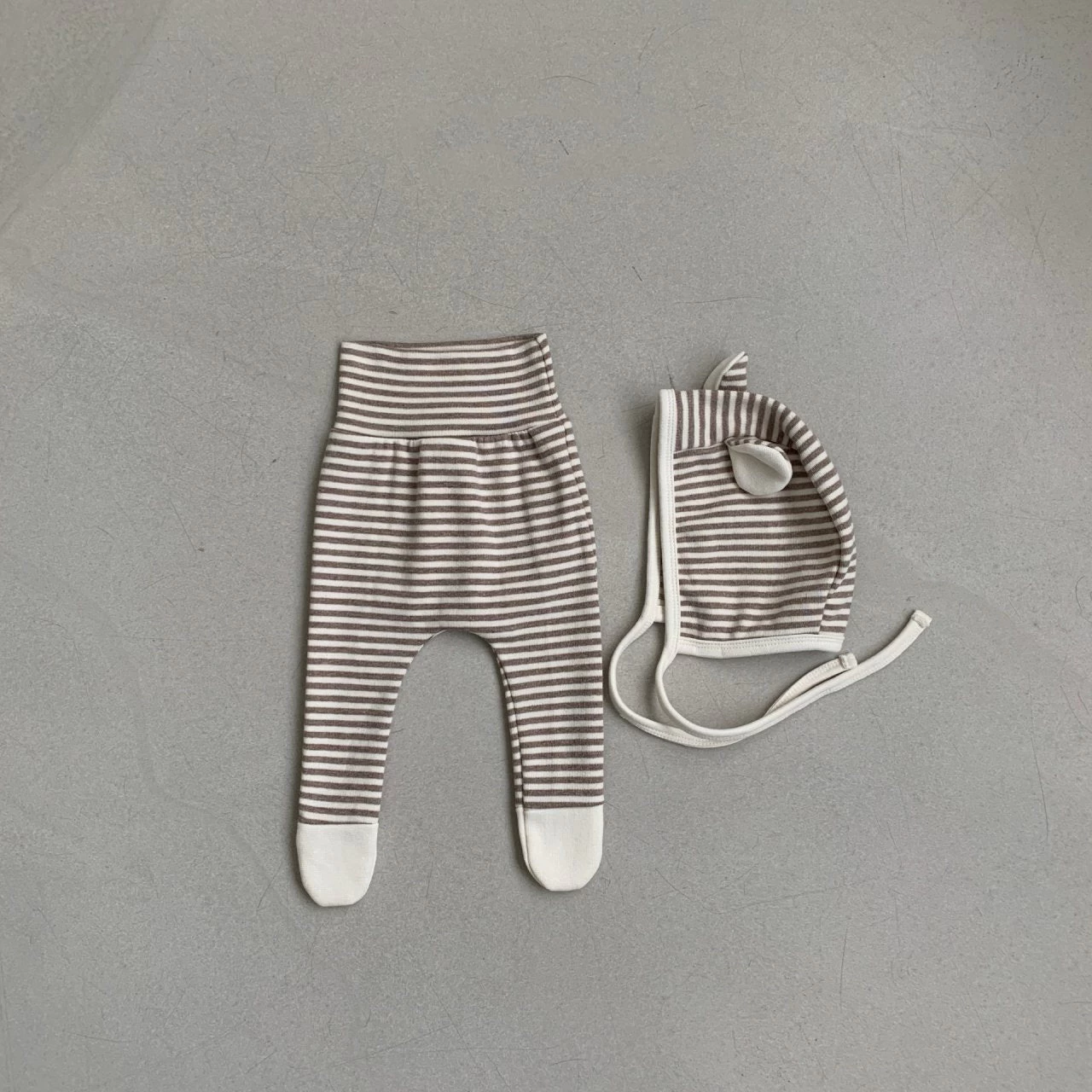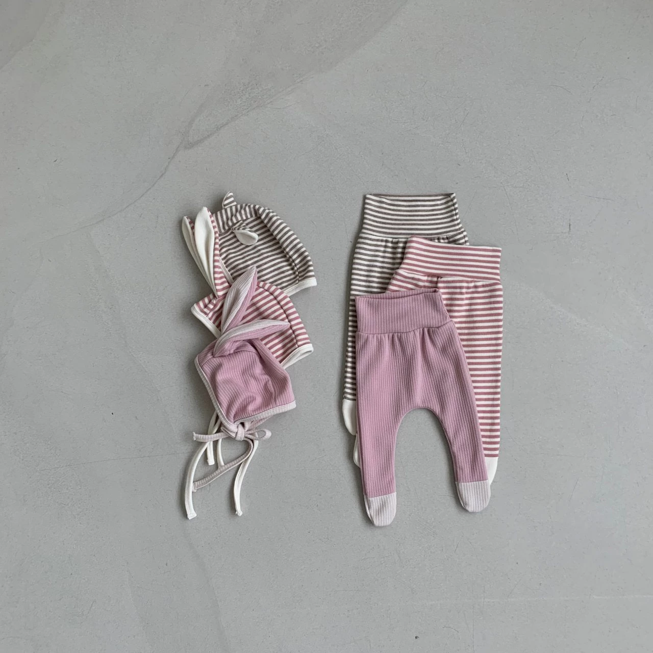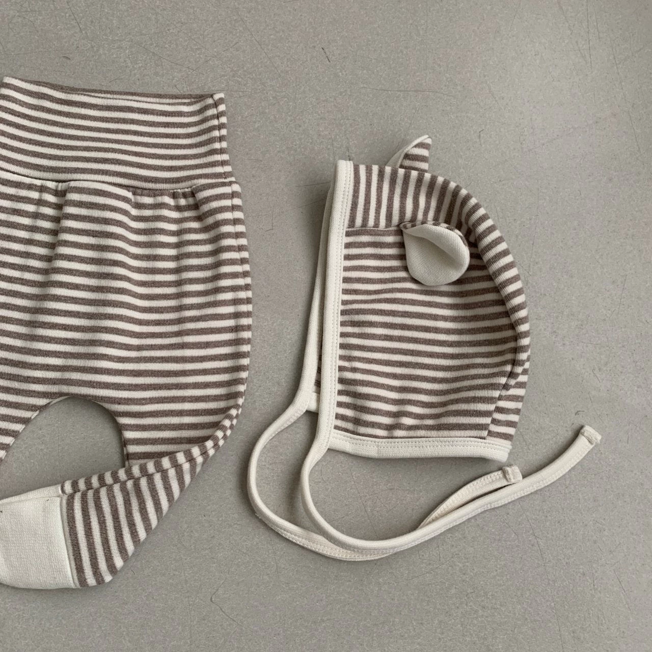 Buttery soft striped footed leggings with a matching bonnet w/rabbit ears.