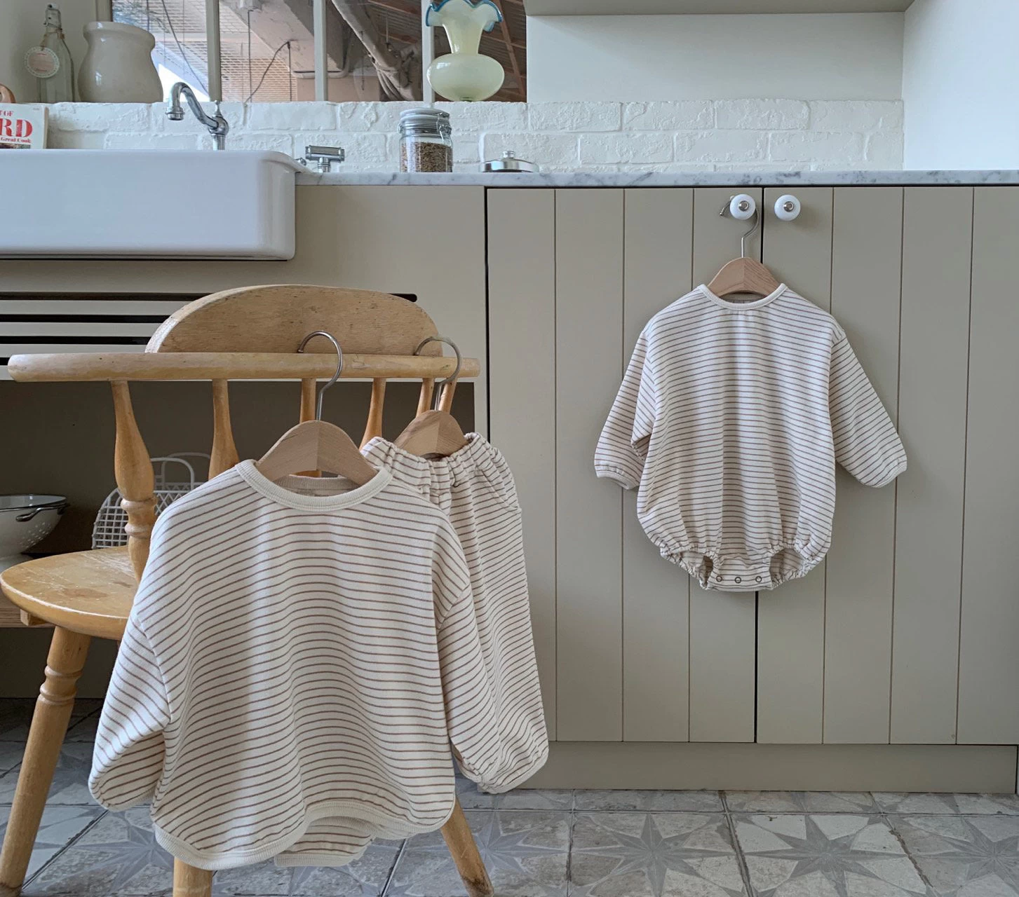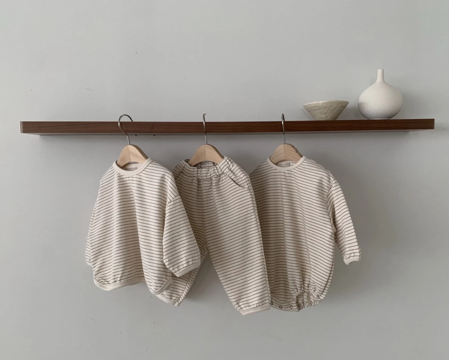 A classic striped, gender neural, lightweight sweatshirt romper.