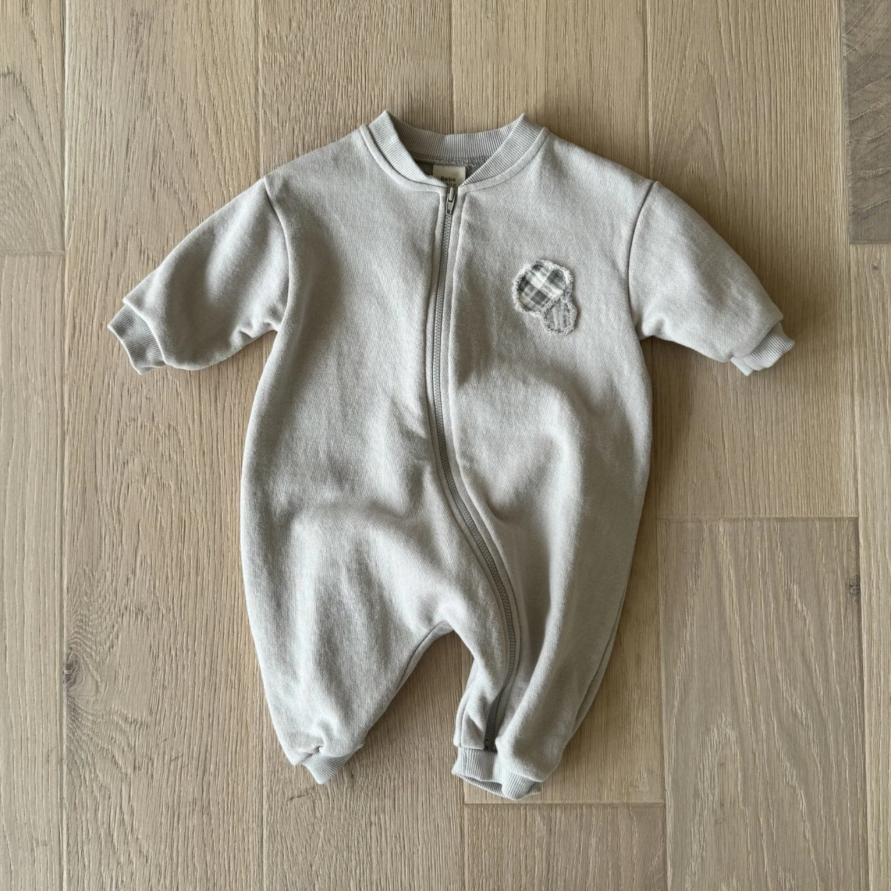 An oversized zip up romper featuring circle patches.
