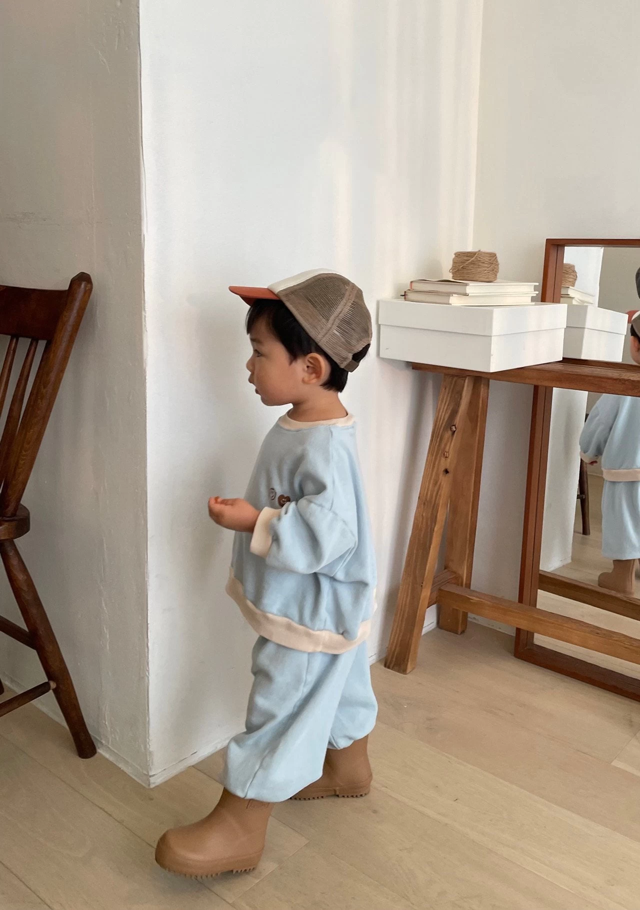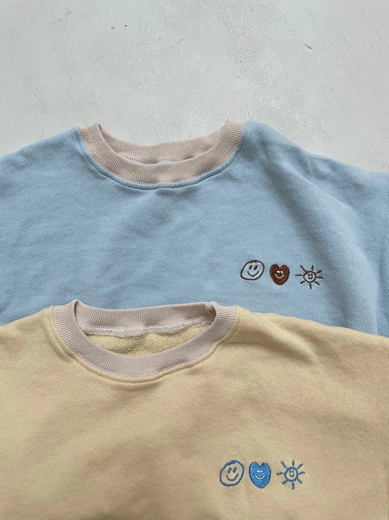 A perfectly oversized crewneck and matching joggers featuring happy embroidery details.