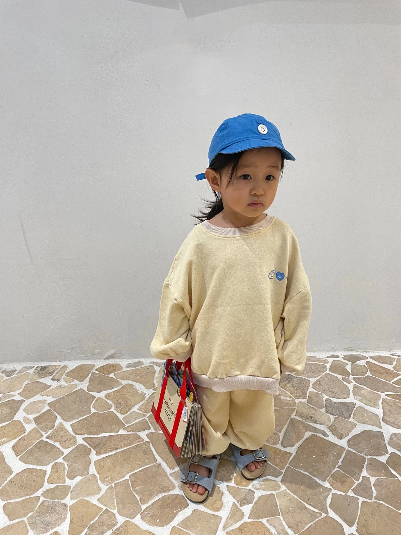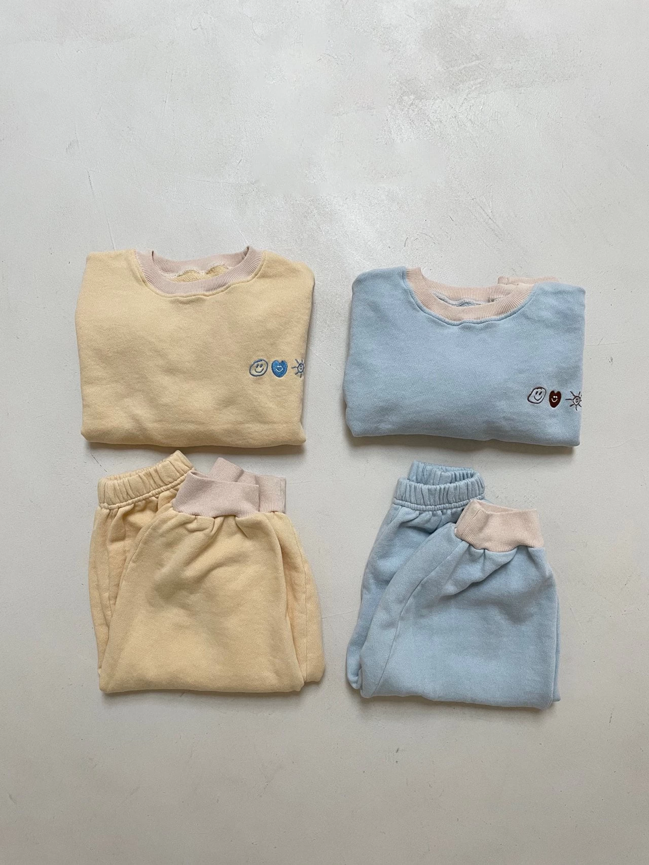 A perfectly oversized crewneck and matching joggers featuring happy embroidery details.