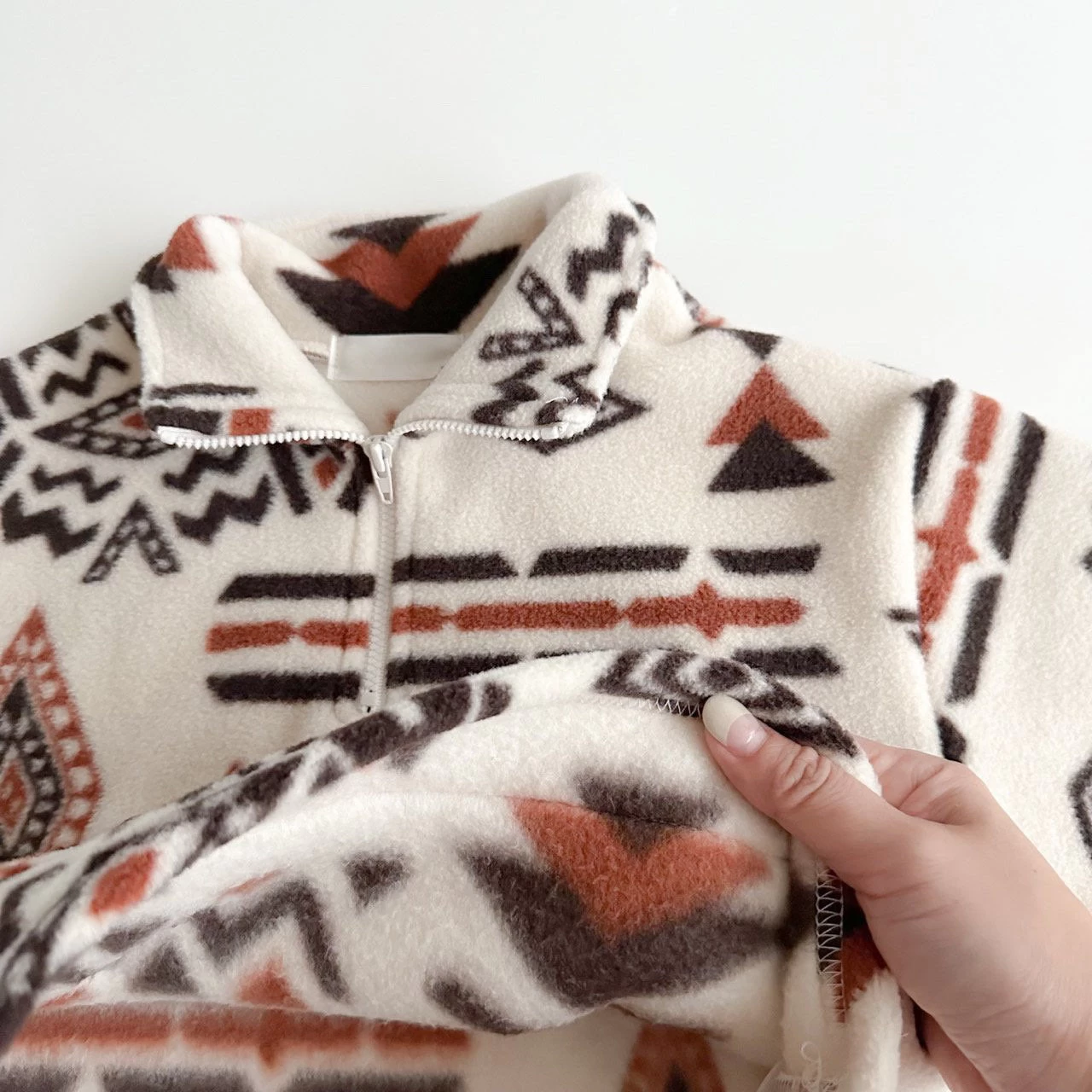 A cozy quarter zip anorak featuring an allover geo print and kangaroo pockets to keep the tiny hands warm!