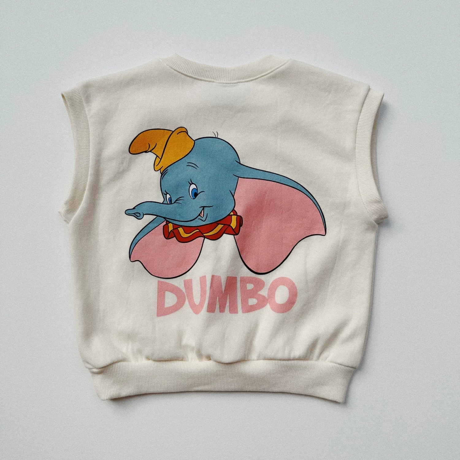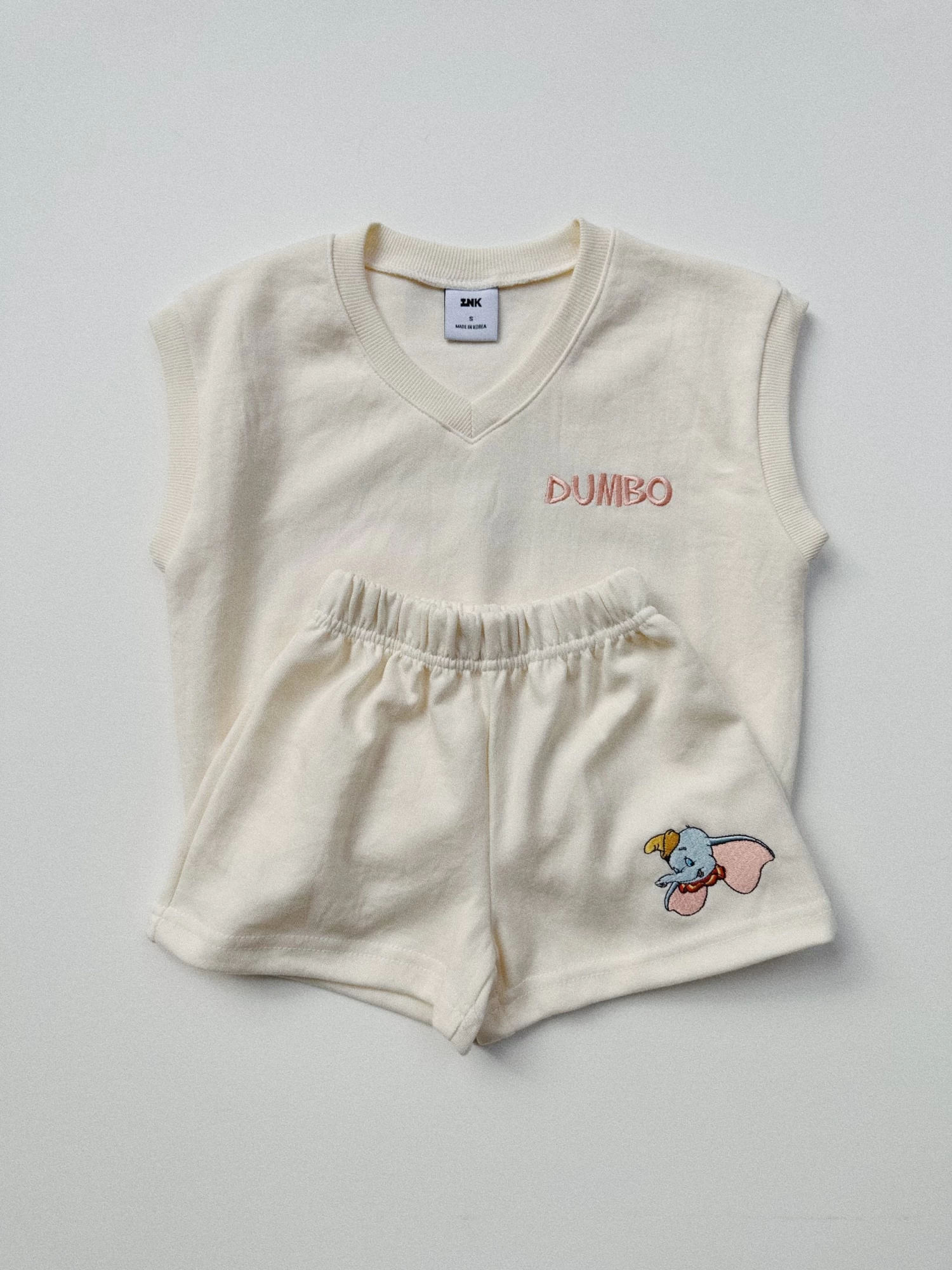 A sleeveless terry vest featuring embroidery on the front and a large graphic on the back. Matching shorts with an embroidery of the Disney character’s face.