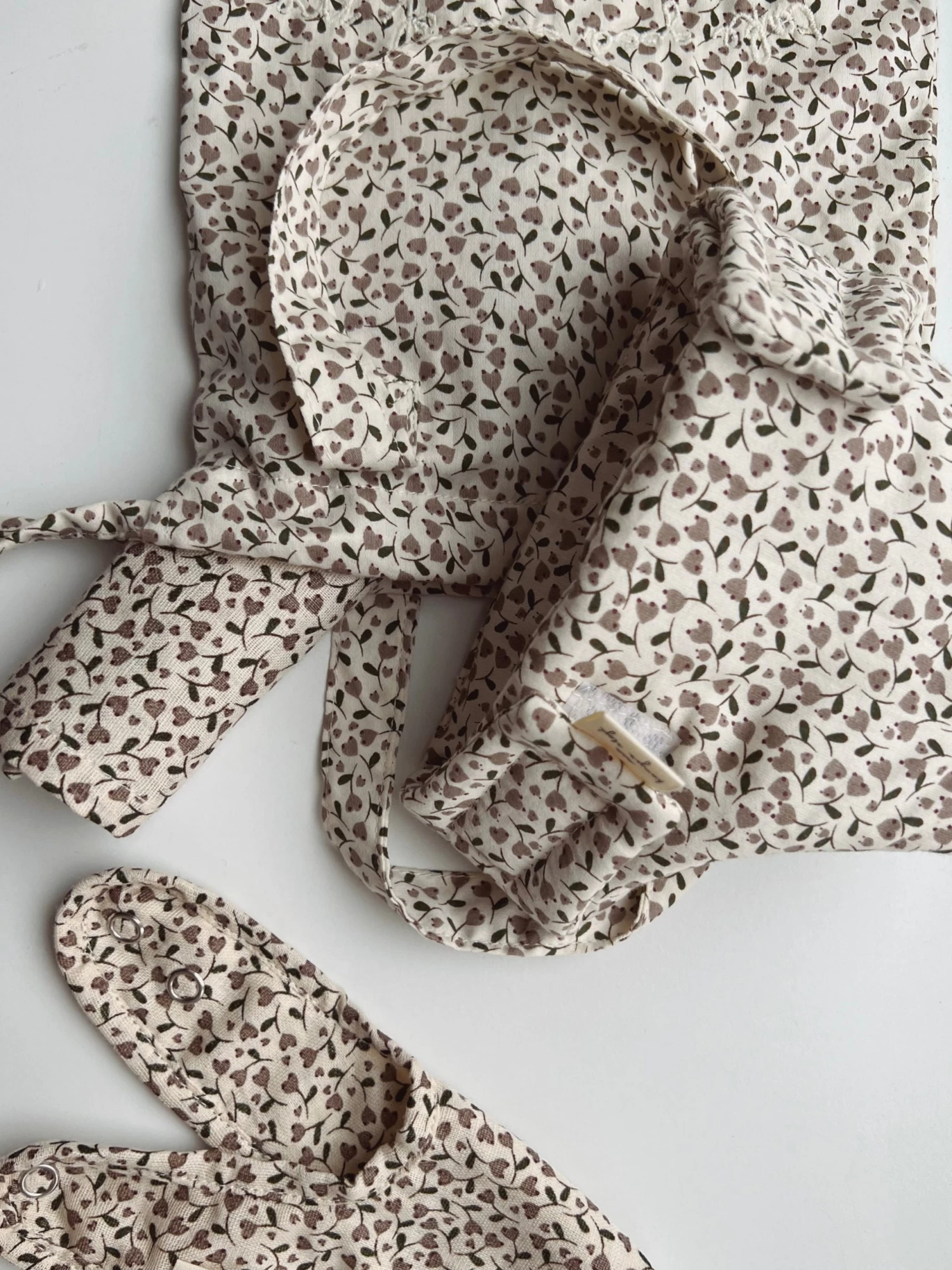 A set of 3 items which includes a bib, muslin cloth, and a diaper with a velcro closure for a doll.