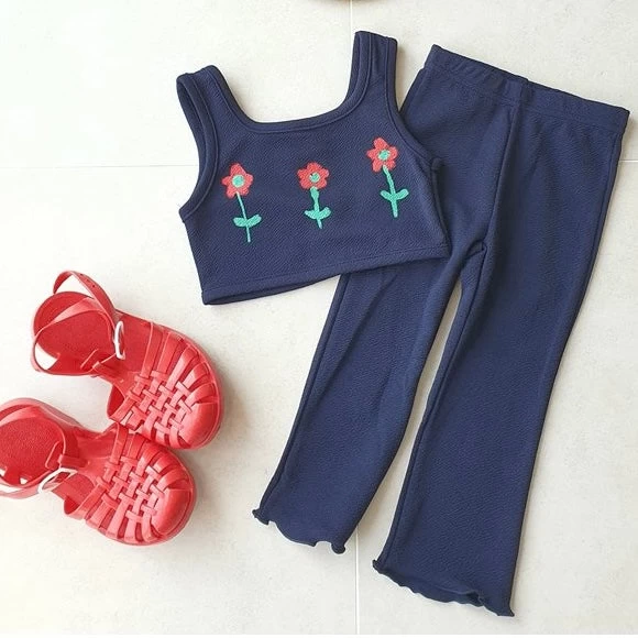 A sleeveless crop top and matching flared pants featuring lettuce trim details.