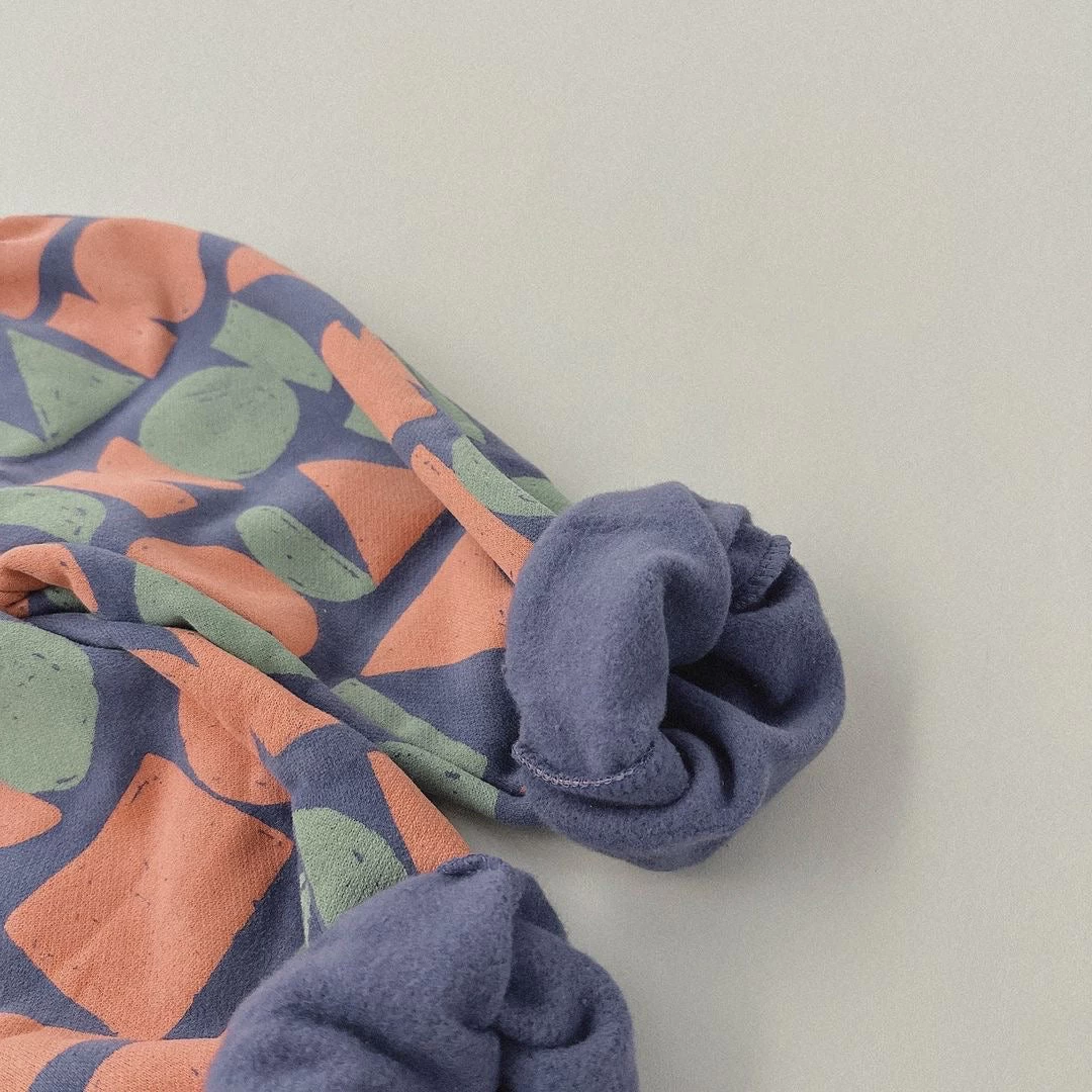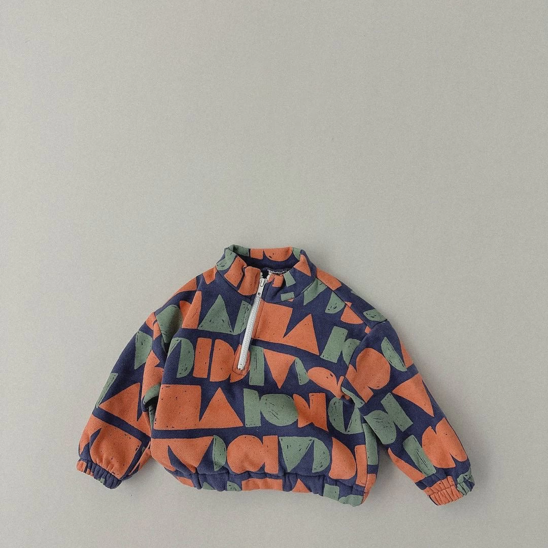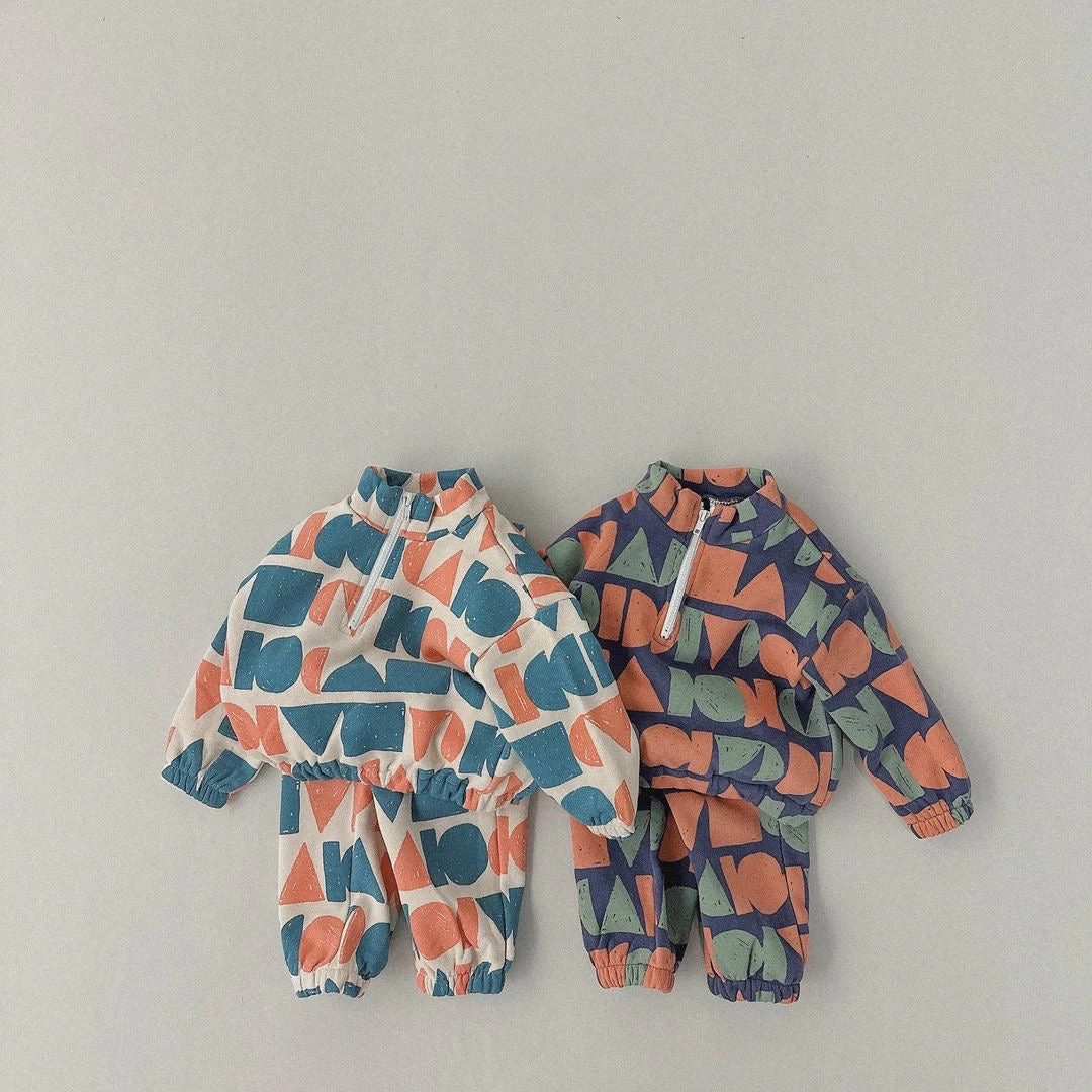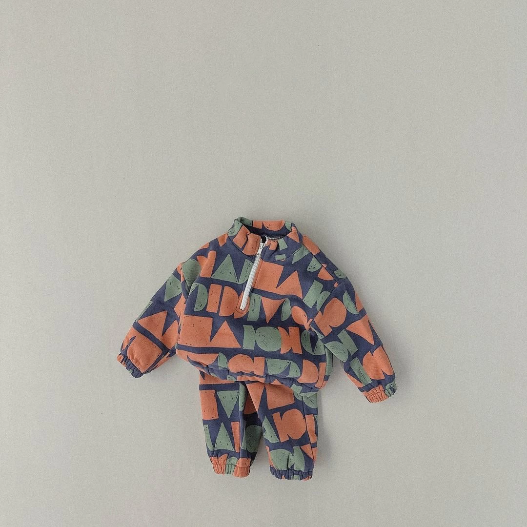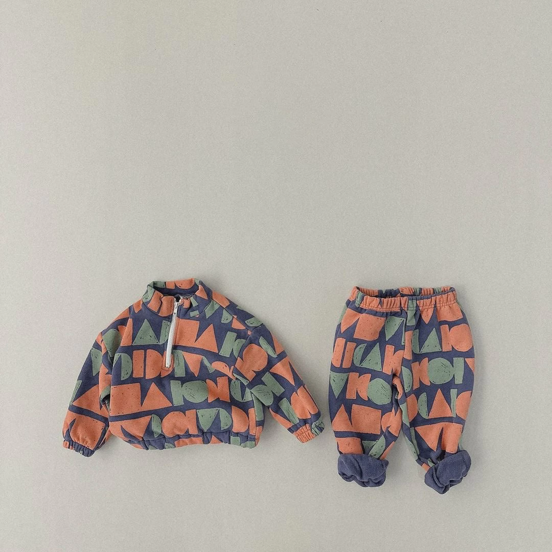 A cozy zip anorak sweat set featuring an allover geo print and brushed cotton on the inside for extra warmth.
