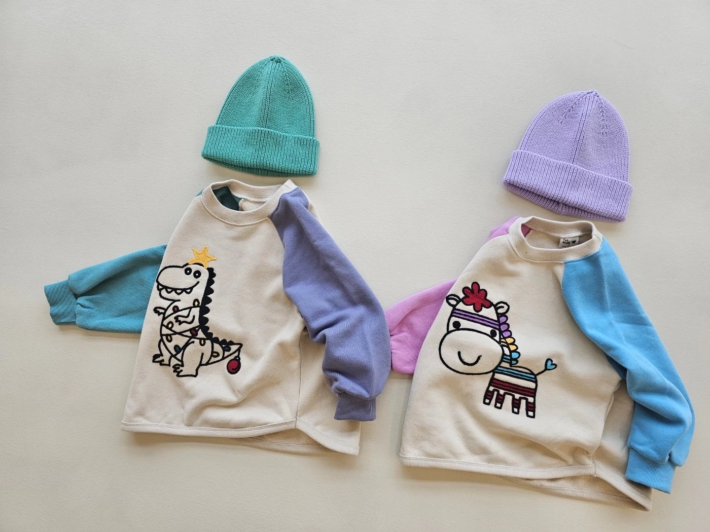 A cozy color block crewneck sweatshirts featuring a cute giraffe graphic.