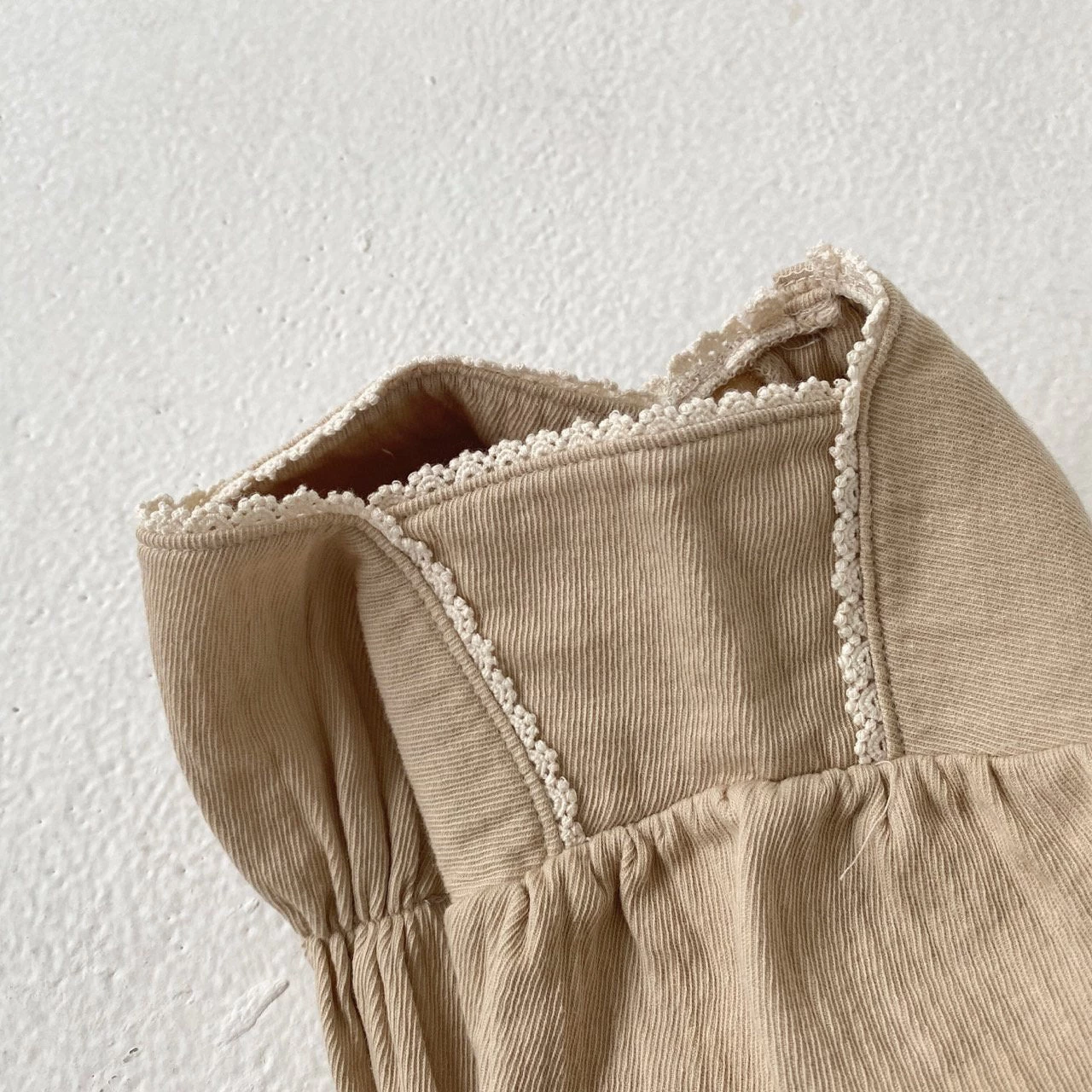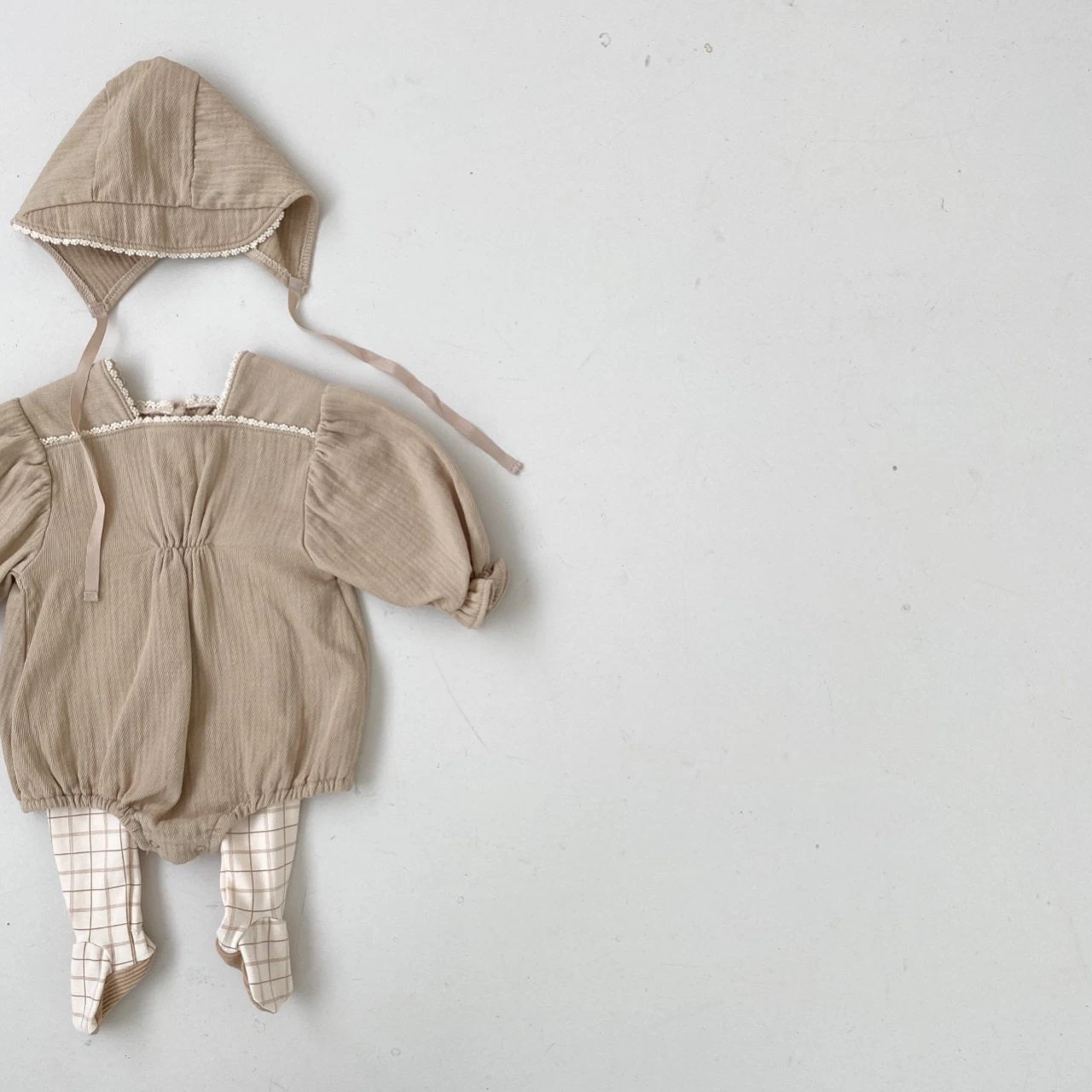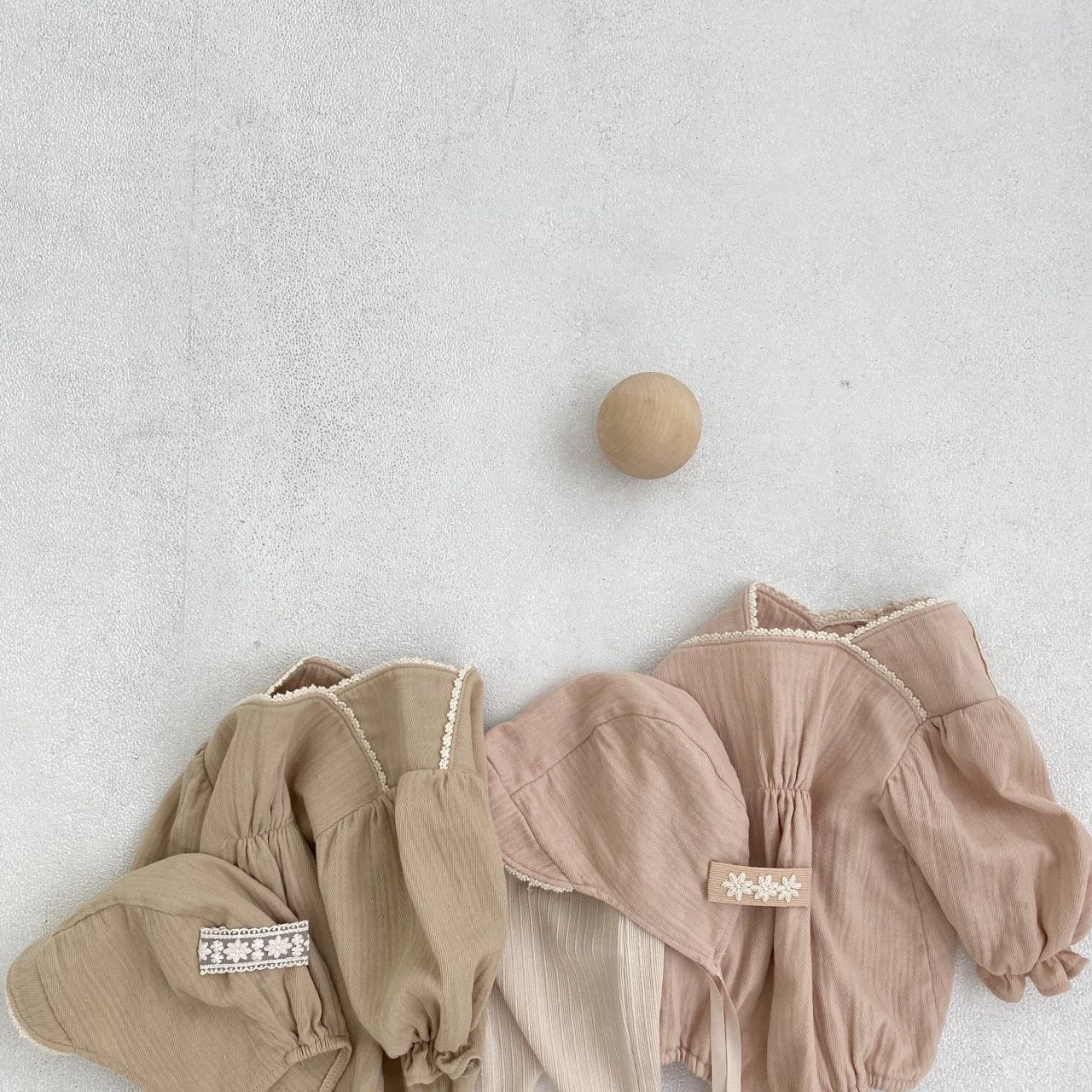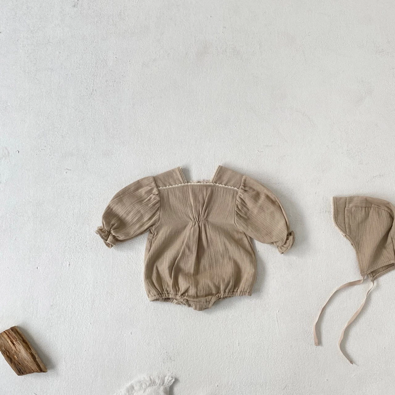 A long sleeved romper featuring cinched wrist details and lace eyelet trim details at the neckline. Matching bonnet included.