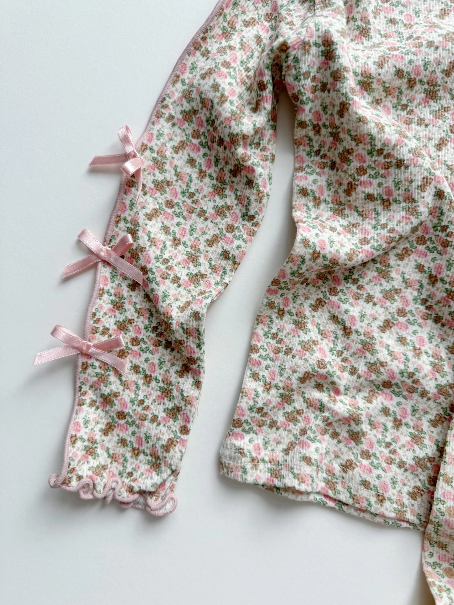A floral print top and matching leggings featuring lettuce trim and bow details along the arms and legs.