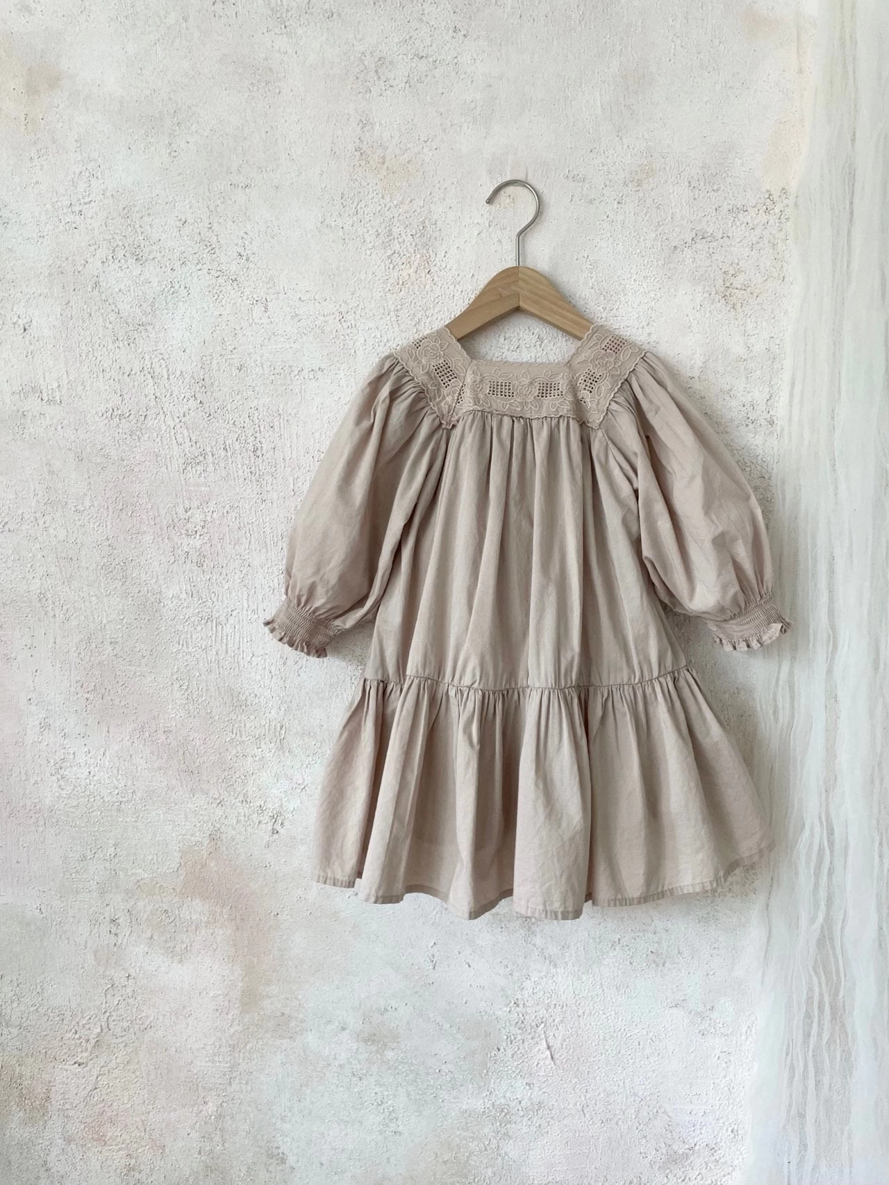 A beautiful puff sleeved dress featuring a square neckline, lace eyelet details, and smocking at the cuff.