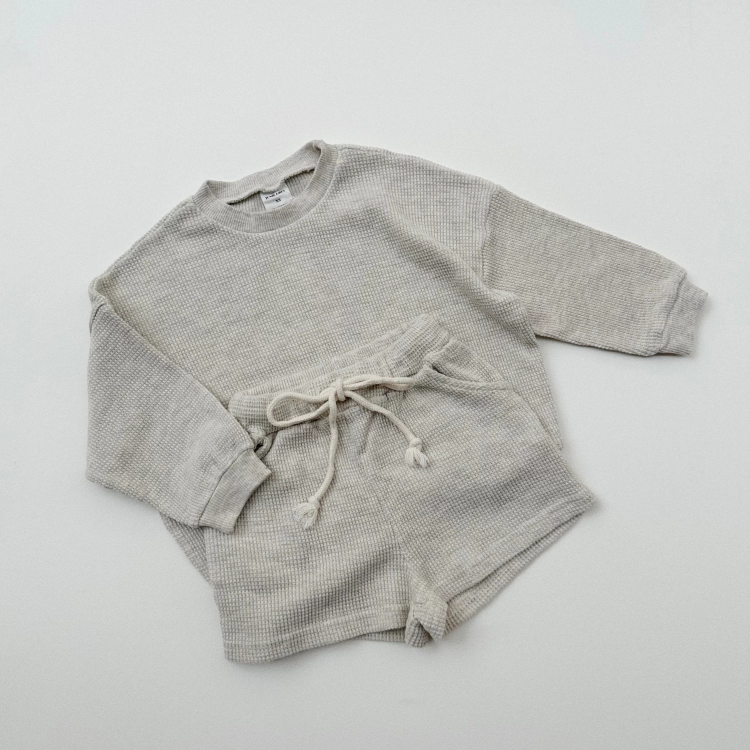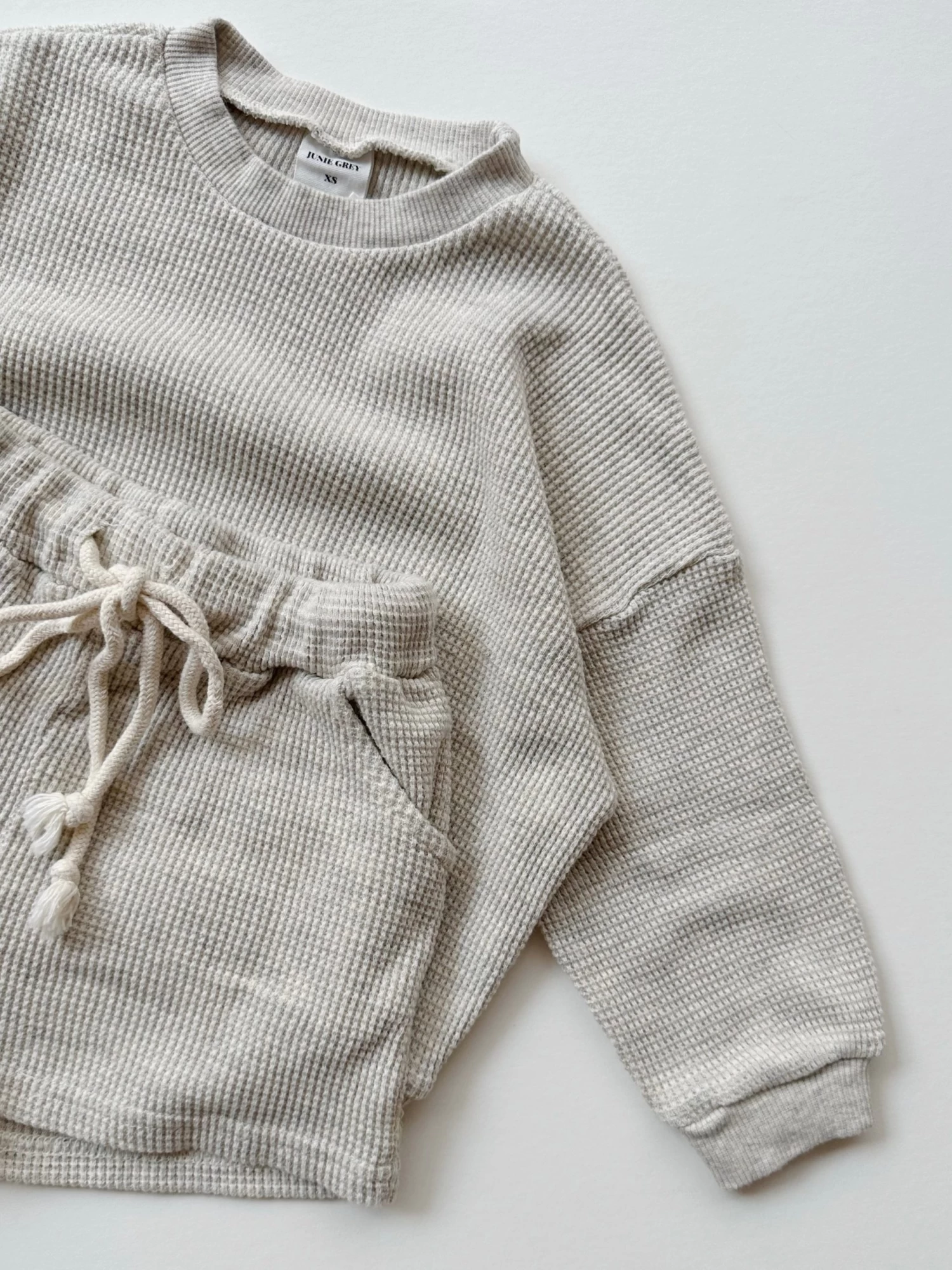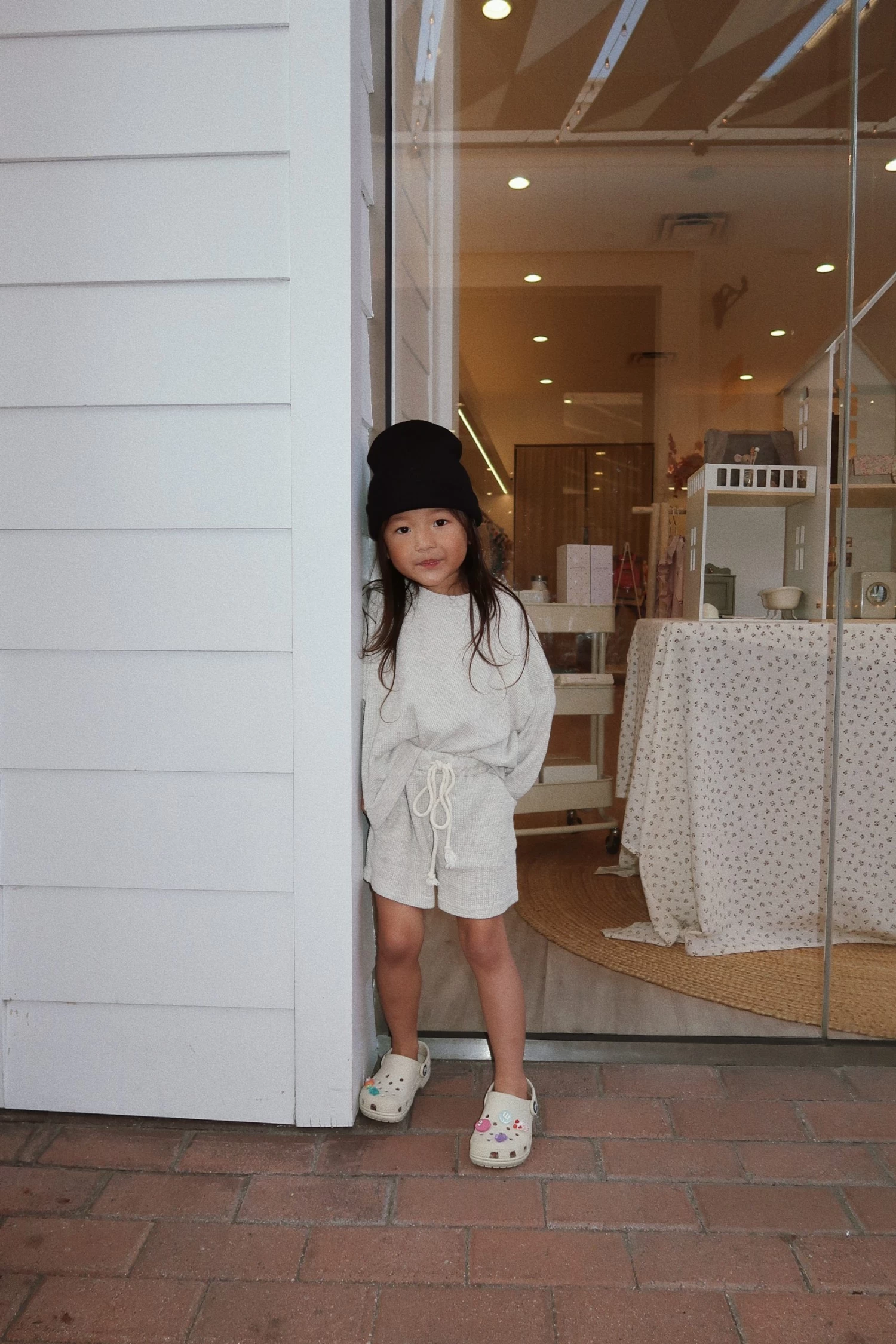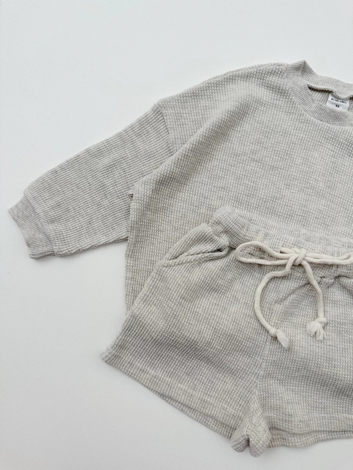 Mommy + Mini luxe waffle sets to live in this season. A perfectly oversized crewneck top featuring matching shorts w/pockets for a stylish cozy outfit.