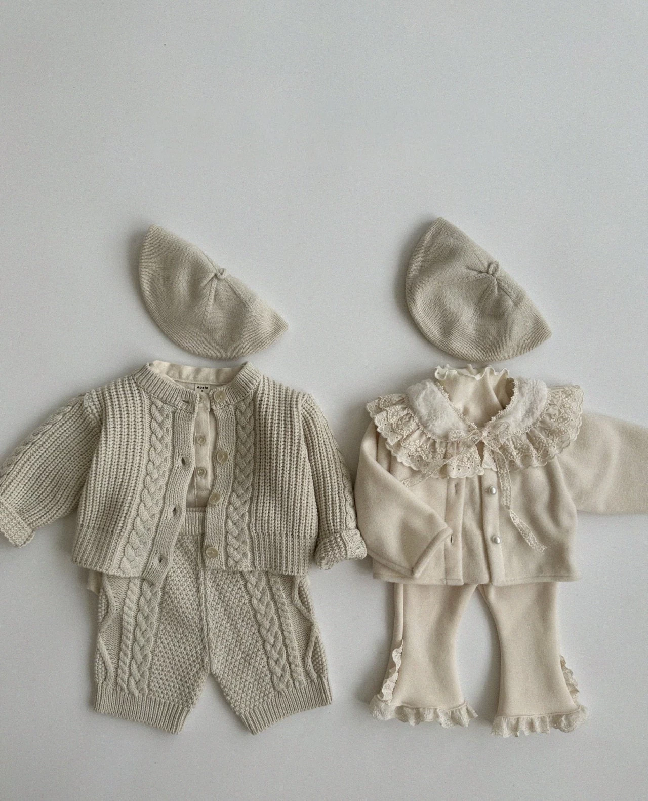 A cozy button up knit cardigan. Matching pants available, sold separately.
