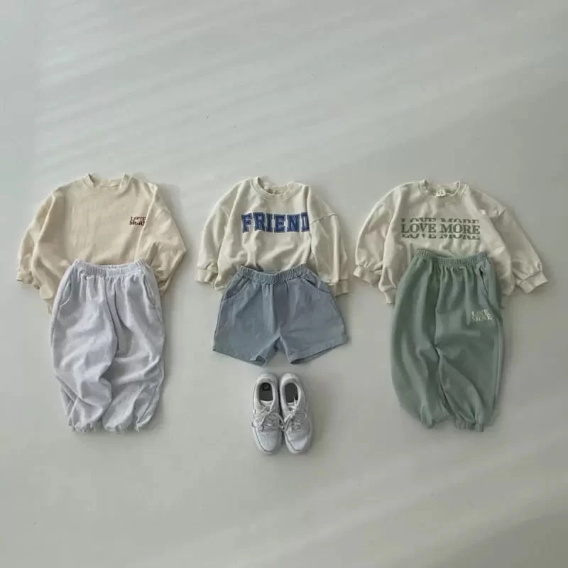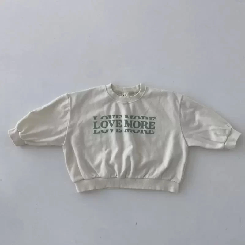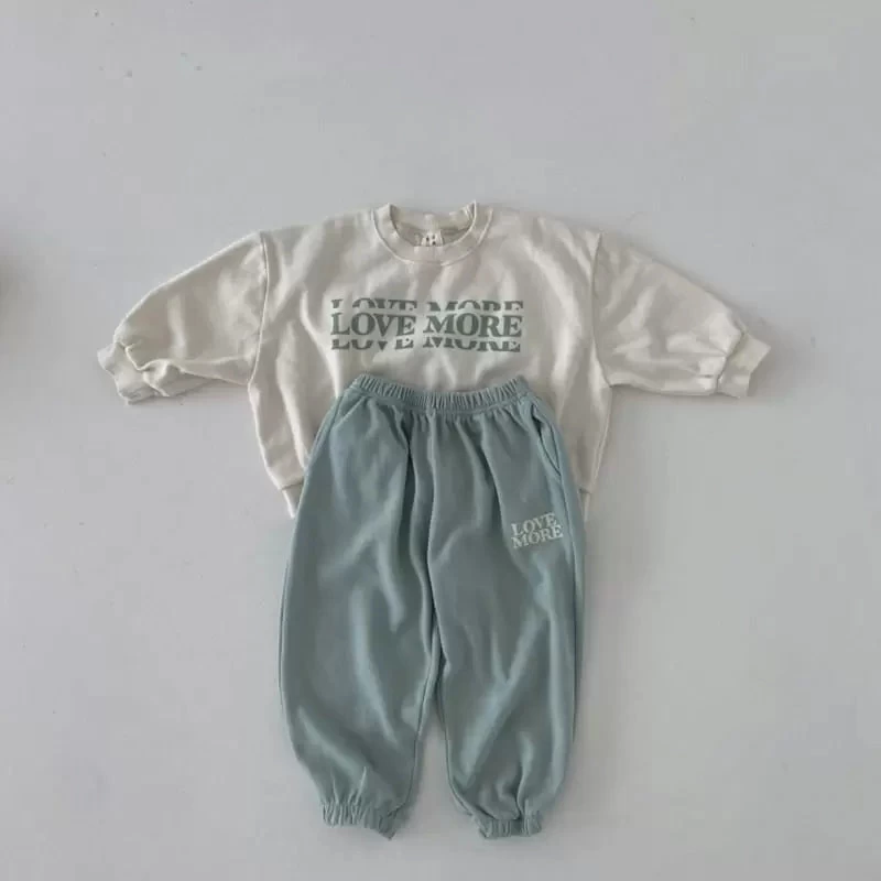 A perfectly oversized crewneck sweatshirt and matching joggers featuring “love more” graphics.