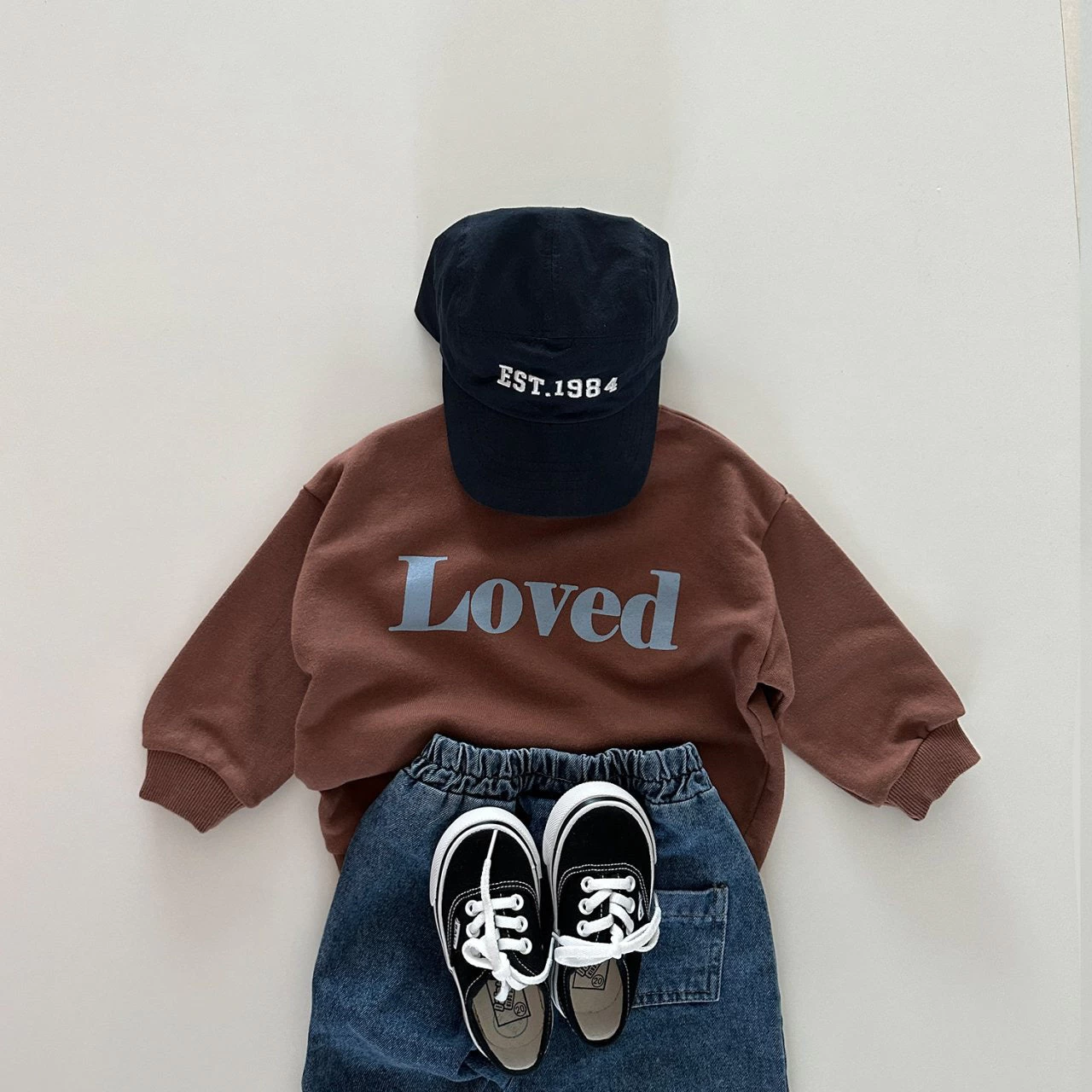 A cozy, gender neutral crewneck sweatshirt featuring “loved” printed across the front.