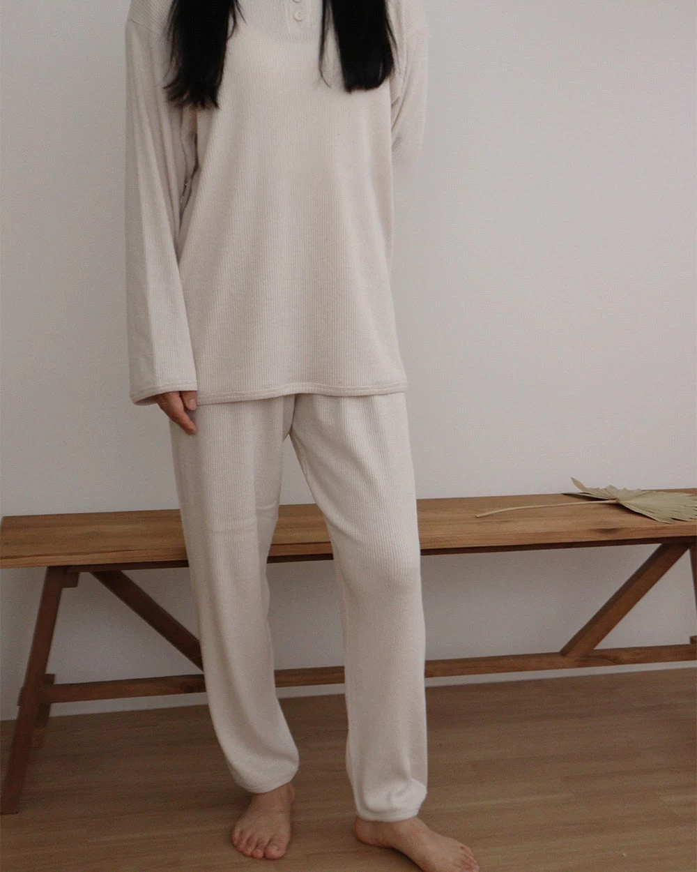 A cozy ribbed top and matching pants featuring button up details