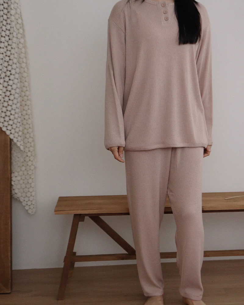 A cozy ribbed top and matching pants featuring button up details