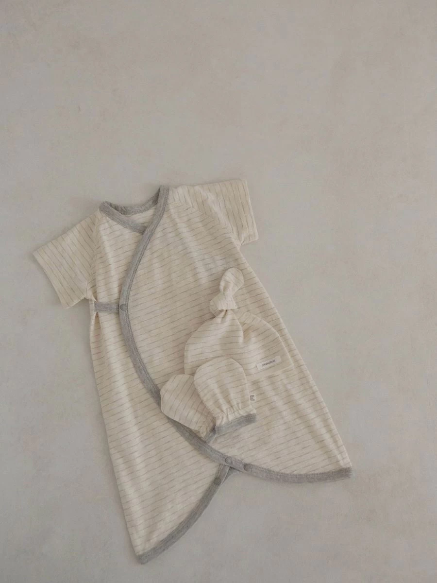 A striped newborn onesie set with a matching hat and gloves best recommended for 0-3 months.