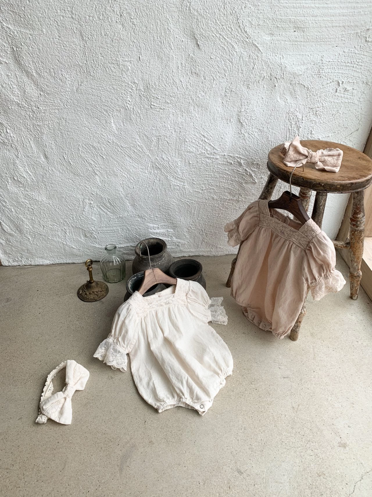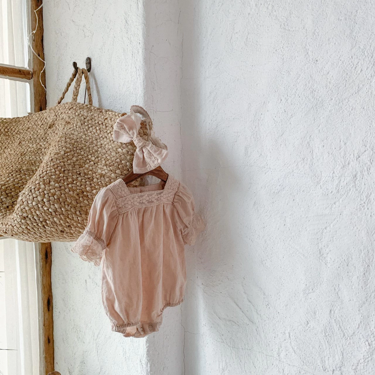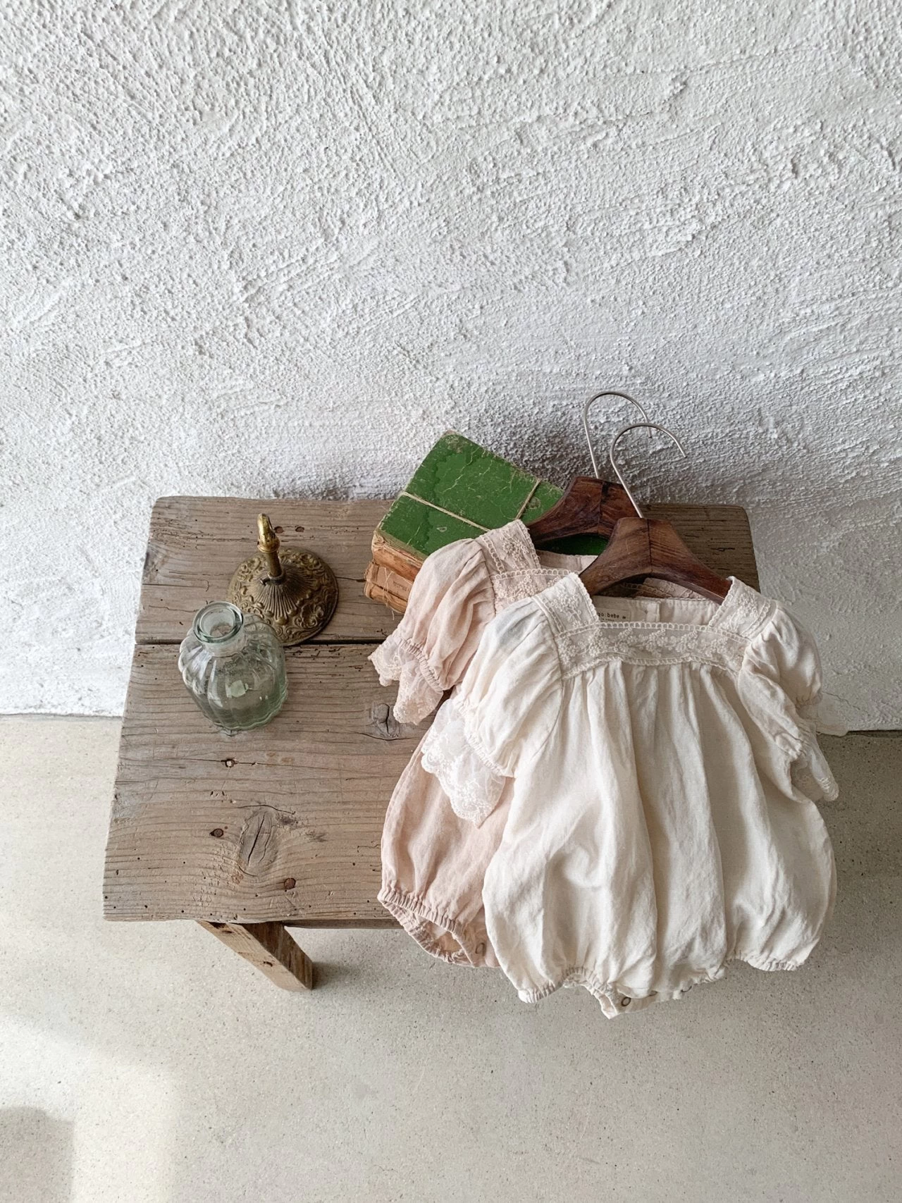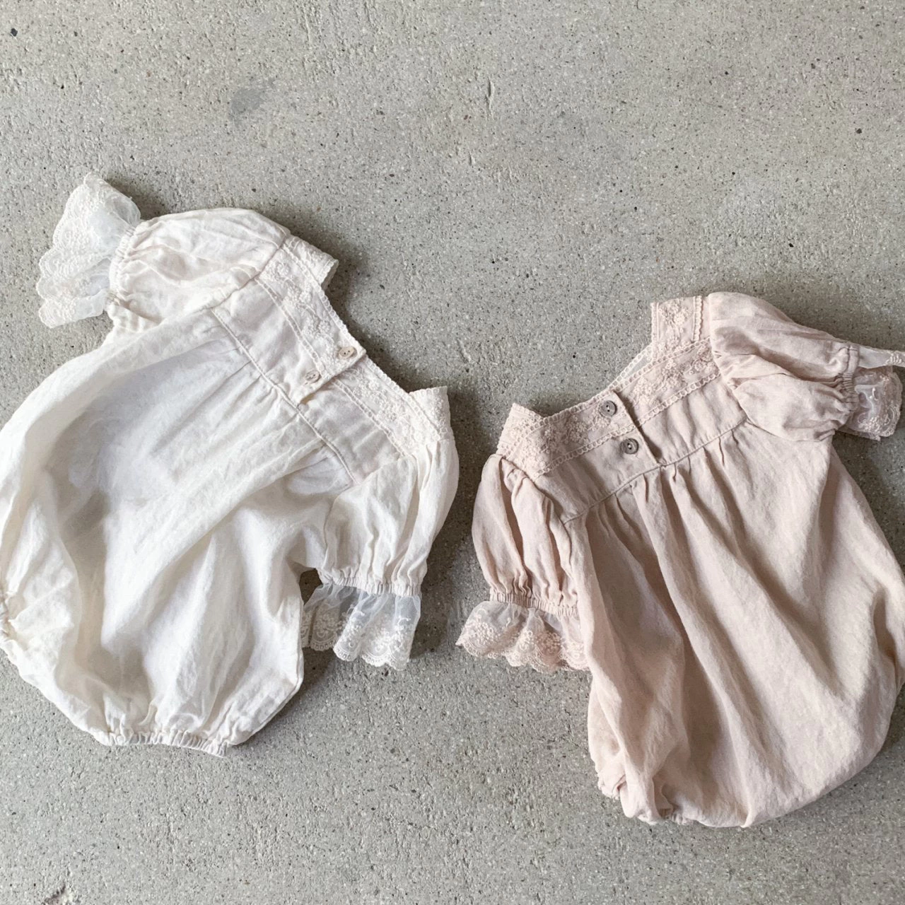 A beautiful bubble romper featuring lace details along the neckline and arms.