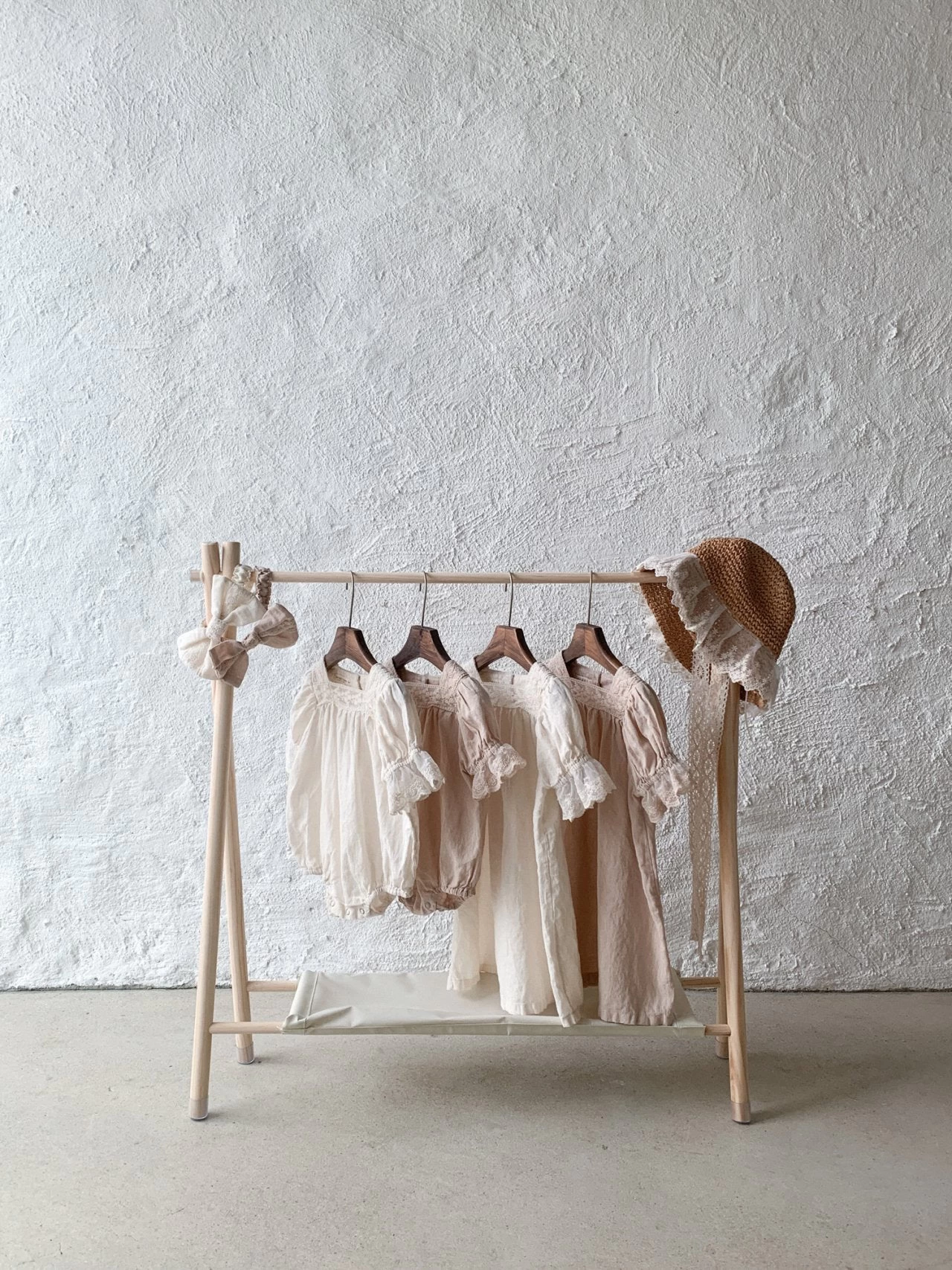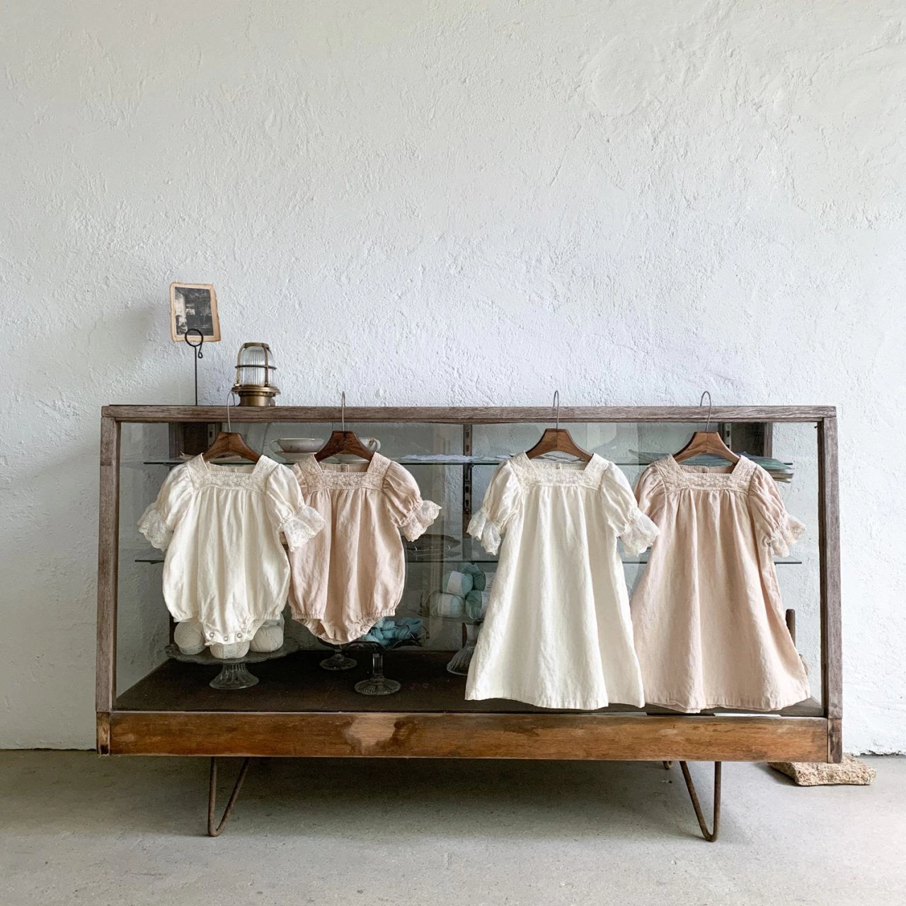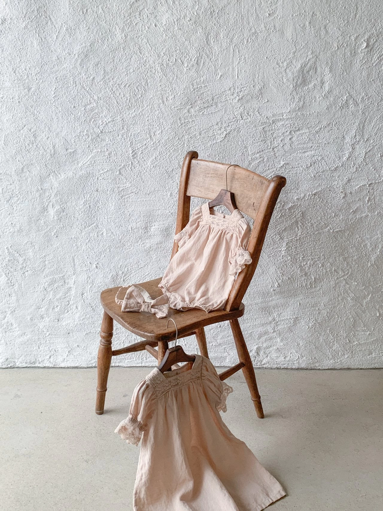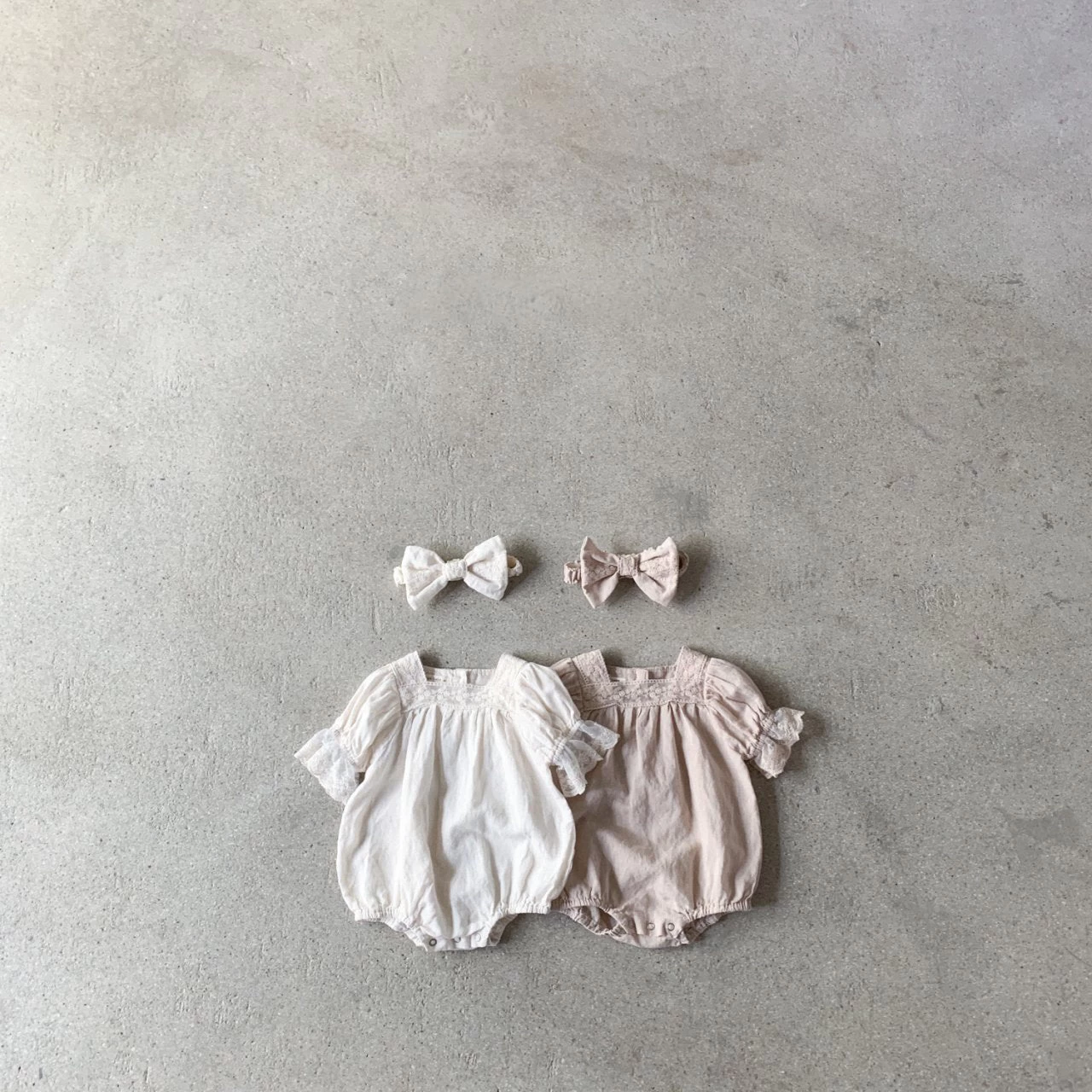 A beautiful bubble romper featuring lace details along the neckline and arms.