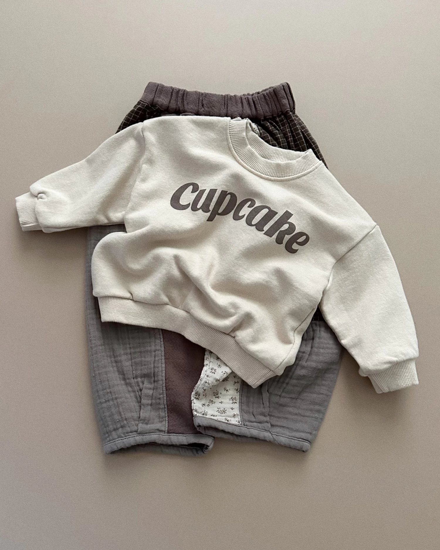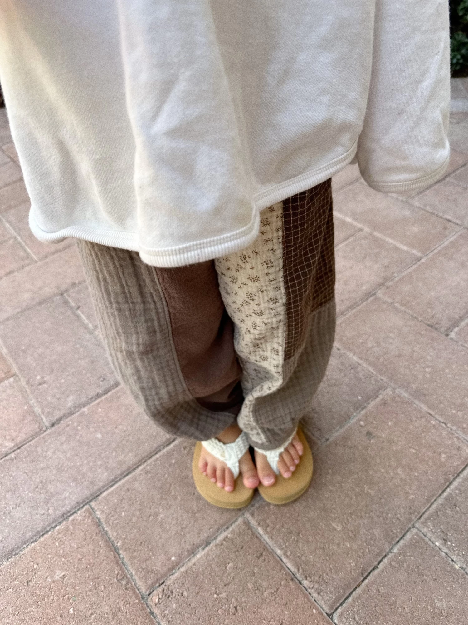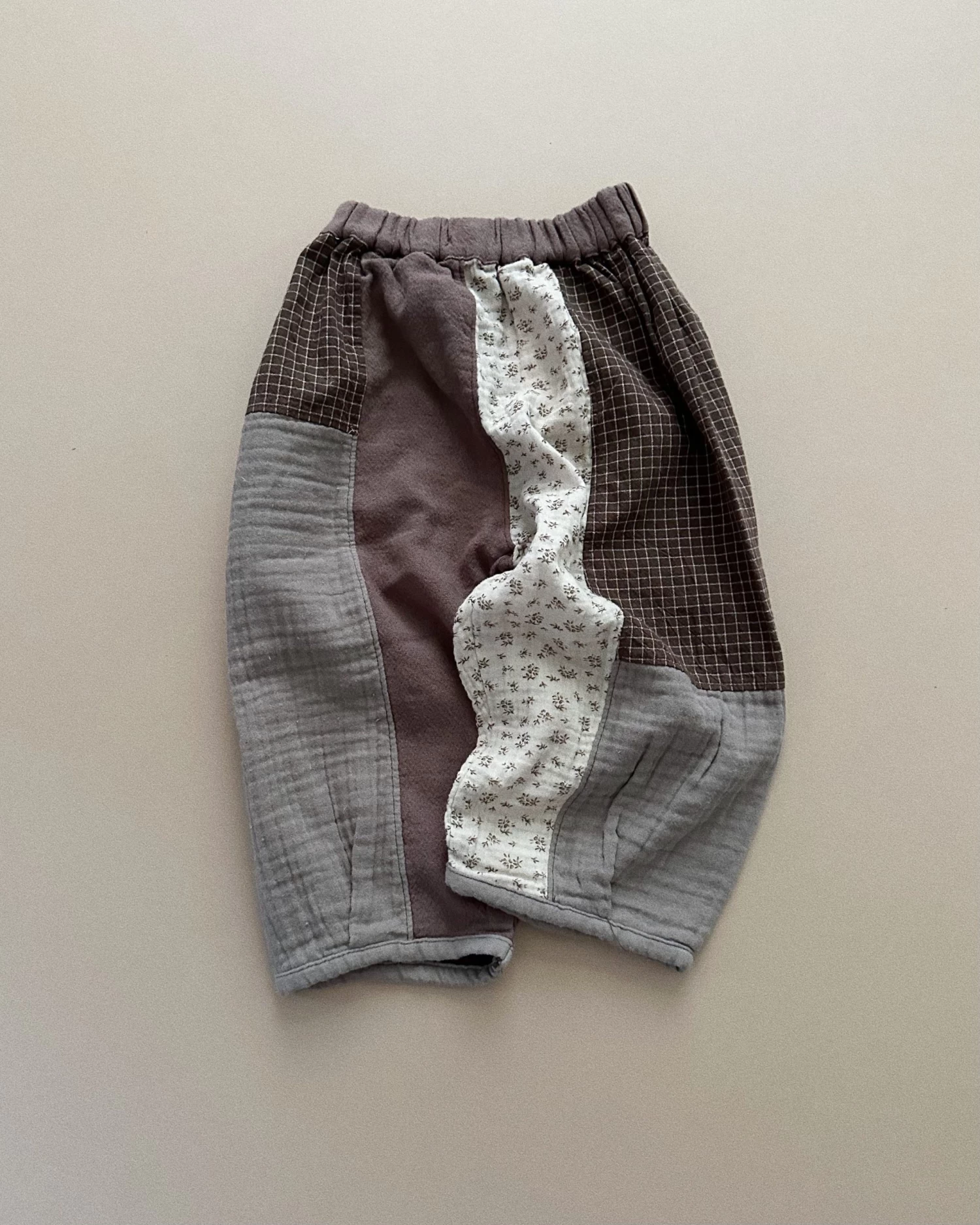 Wide leg pants featuring a patchwork mix of floral gauze and contrast solid earth tones.