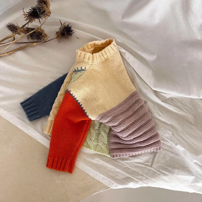A multi colored knit sweatshirt featuring mixed textures and pastel colors.