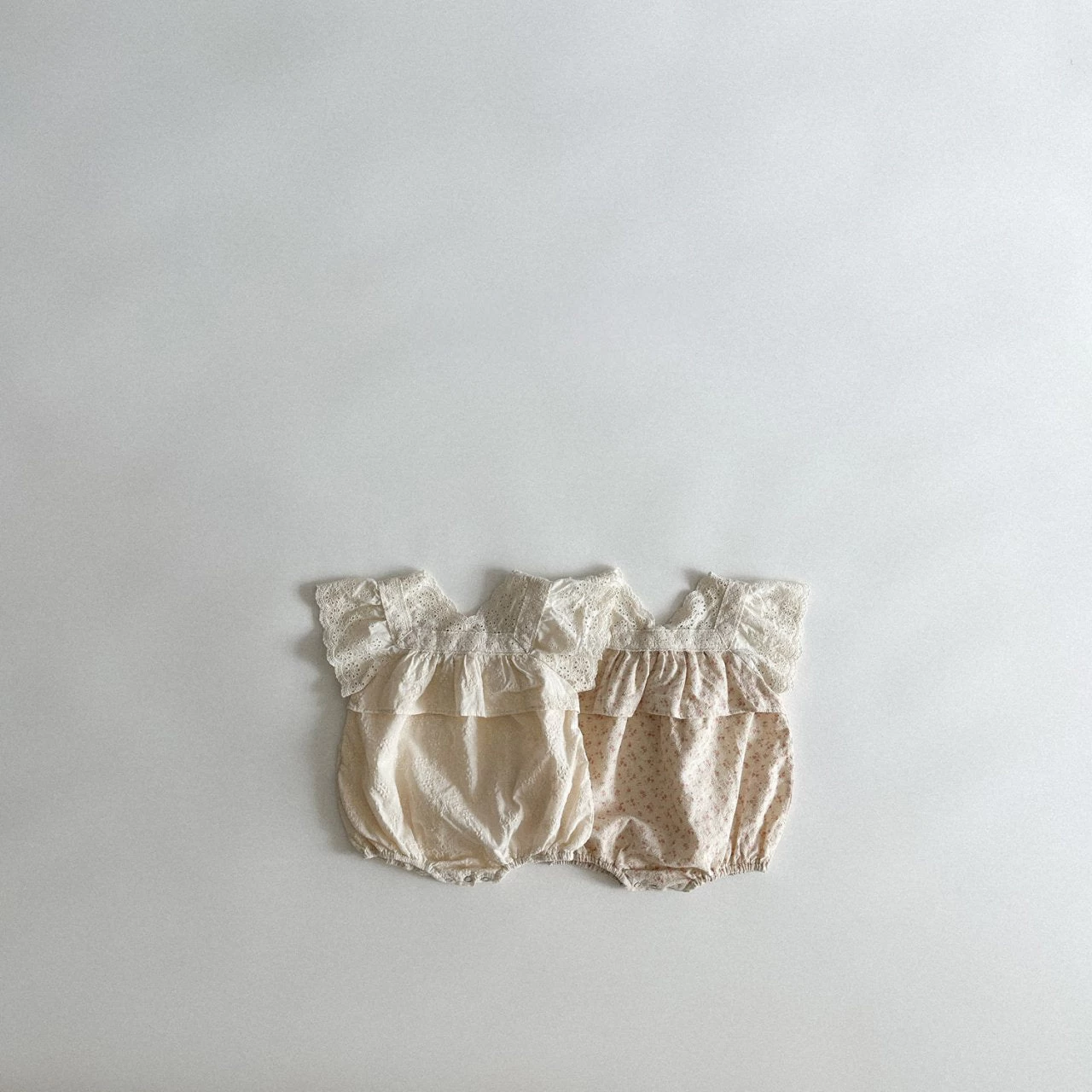 The sweetest romper featuring delicate ruffles and lace trim sleeves. Three button snap closures at the bottom.