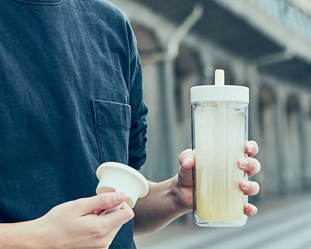 Enjoy the time to unwind and relax with TO GO BOTTLE. The bottle’s double wall structure makes drinks look like they are floating in air and prevents ice from melting quickly, keeping drinks cold for a long time. The straw-type spout is made of soft silicone material which feels smooth on the mouth. With a handle that is comfortable to hold, it is easy to carry around.