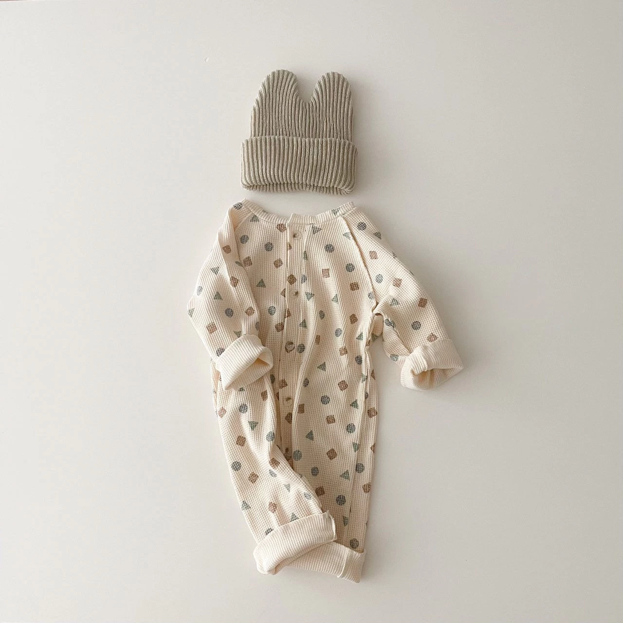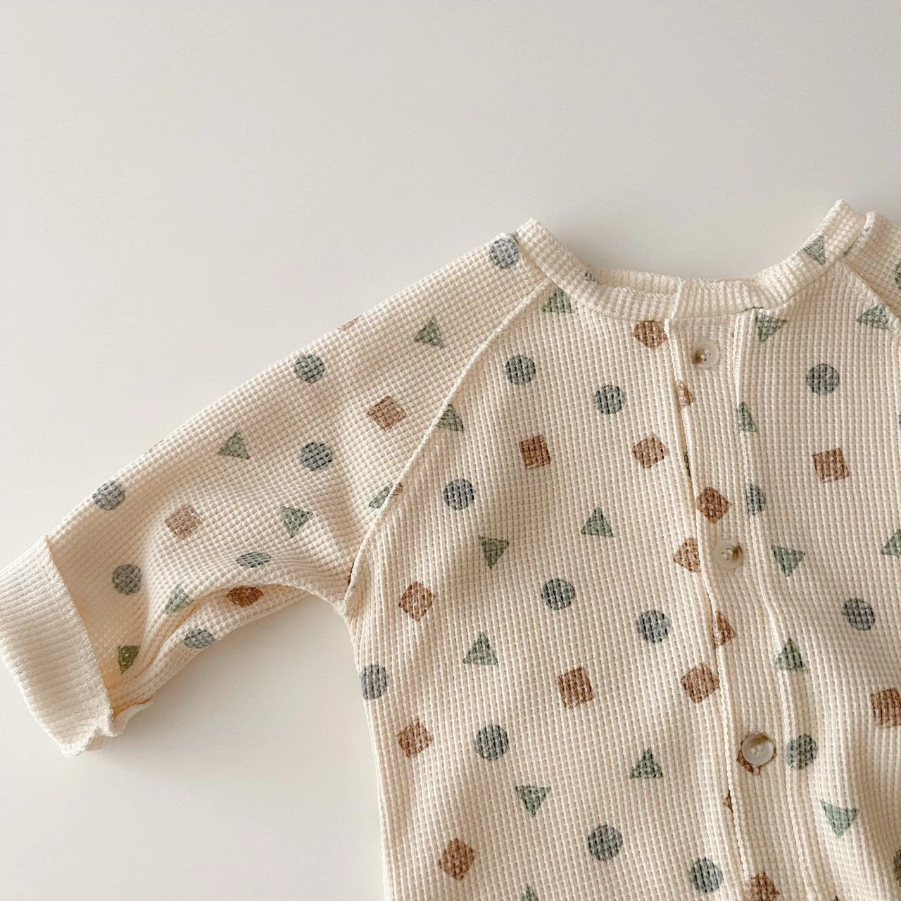 A lightweight long sleeved button up waffle romper featuring soft, neutral shapes printer all over.