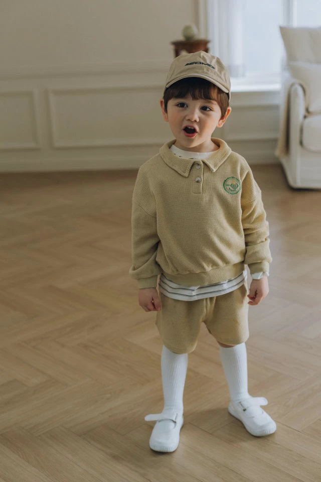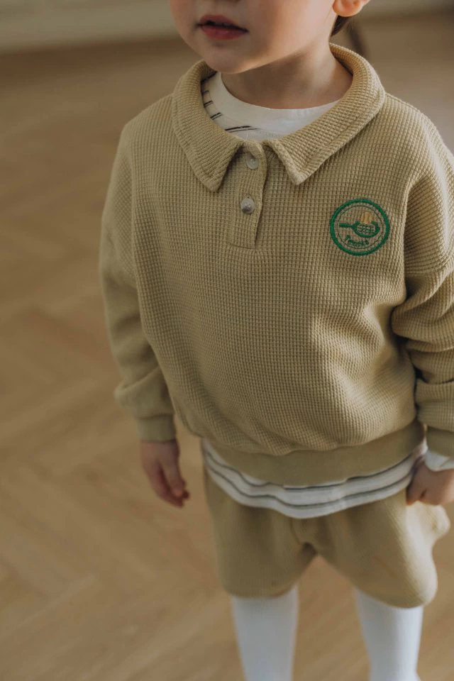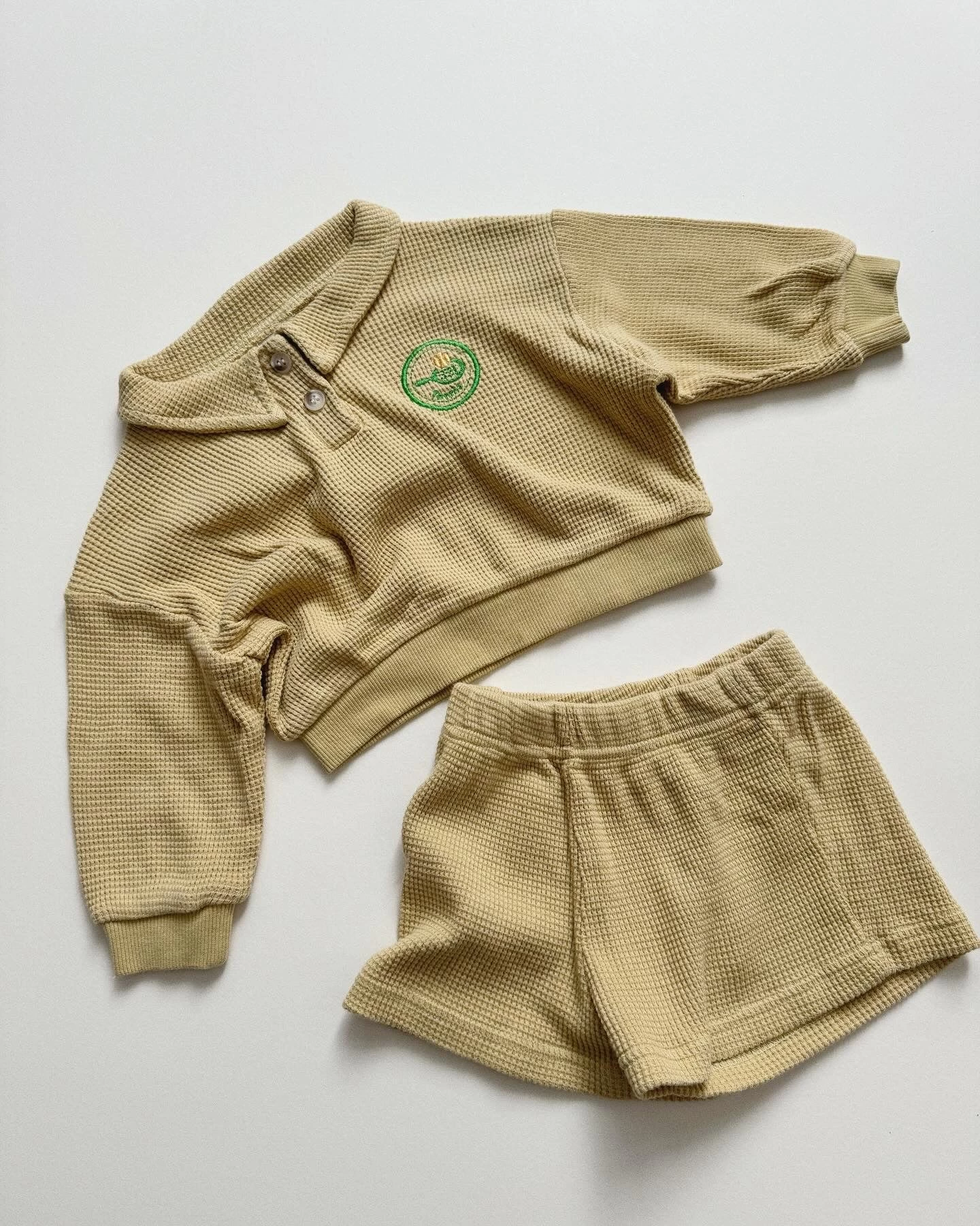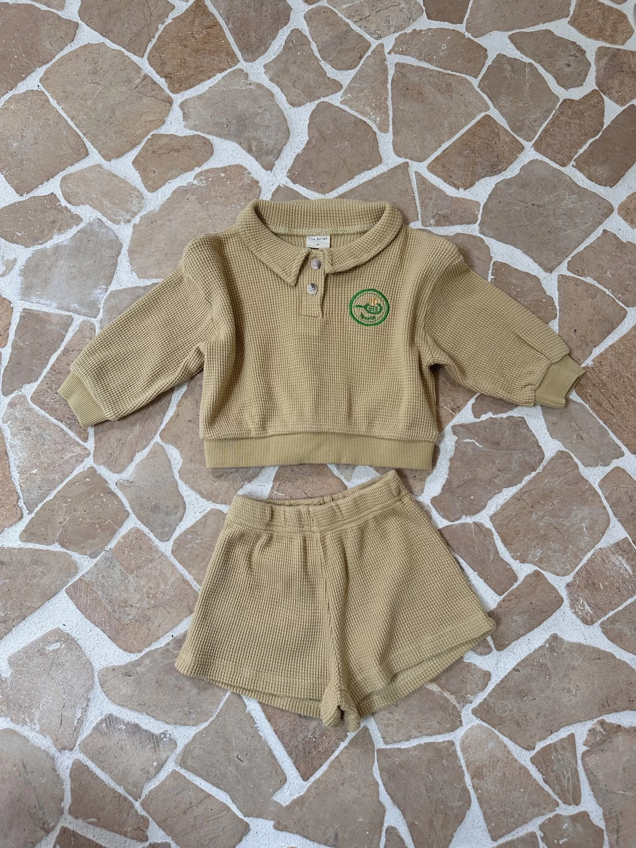 A collared waffle top featuring buttons and tennis embroidery details and matching shorts.